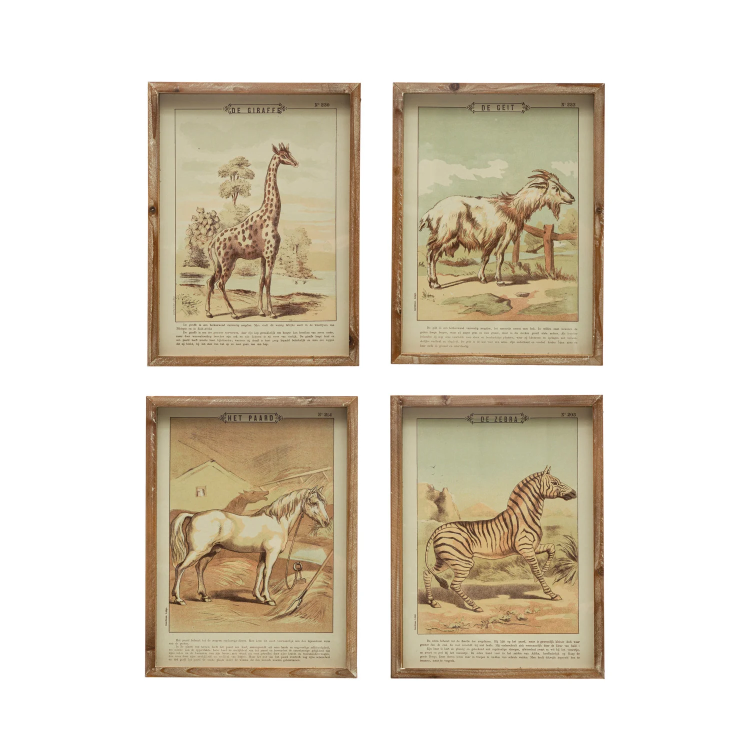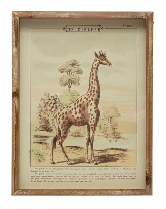 Wall Décor w/ Vintage Reproduction Animal. This whimsical set of wall art features 4 styles of savanna animals encased in wood frames with glass covers.
