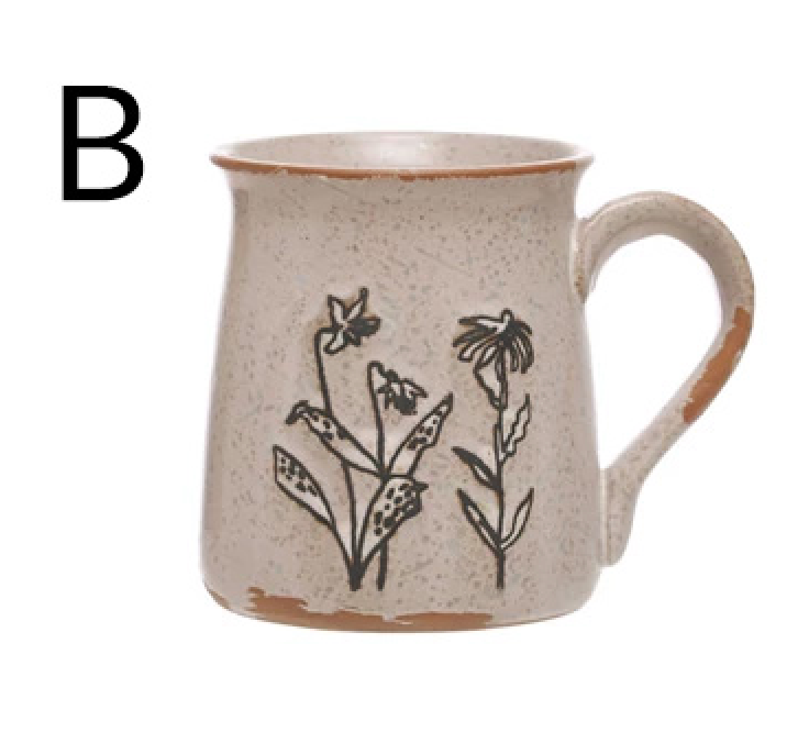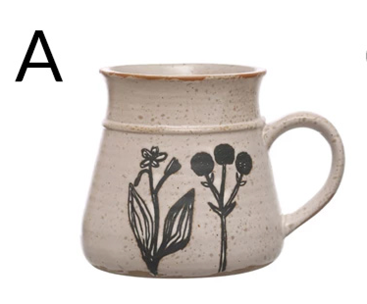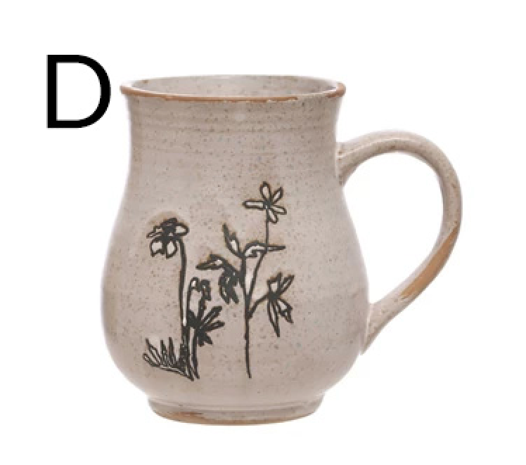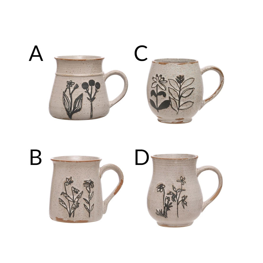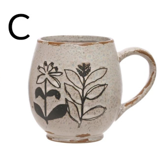 4" Round x 4"H 15 oz. Debossed Stoneware Mug w/ Flowers, Reactive Glaze, White & Black, 4 Styles (Each One Will Vary)