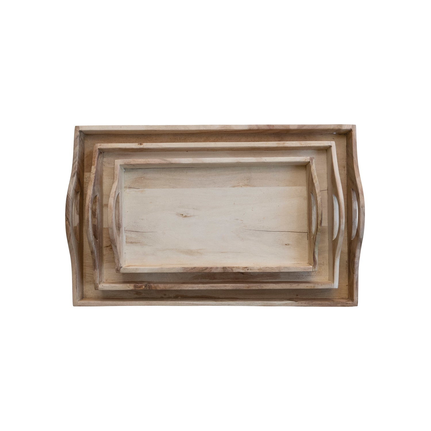 This bleached acacia wood tray with handles is a wonderful way to add charm and convenience to the home. The trays are made of acacia wood bleached to create a light, airy look that complements any farmhouse, French country, coastal, lodge, or cottagecore style home. The trays are rectangular-shaped, ideal for serving or displaying food, drinks, or other items that suit the home. The trays also have a handle on each side, making it easy to carry and serve. The trays measure Measures 22.5 inches in length, 14 inches in width, and 2.75 inches in height, 19.25 inches in length, 11.25 inches in width, and 2.75 inches in height, and 15.75 inches in length, 8.75 inches in width, and 2.75 inches in height and can fit any space. This bleached acacia wood tray with handles set is a versatile and beautiful piece to enhance the home.