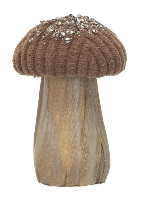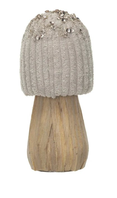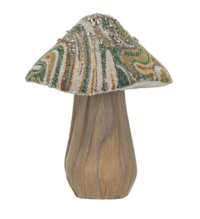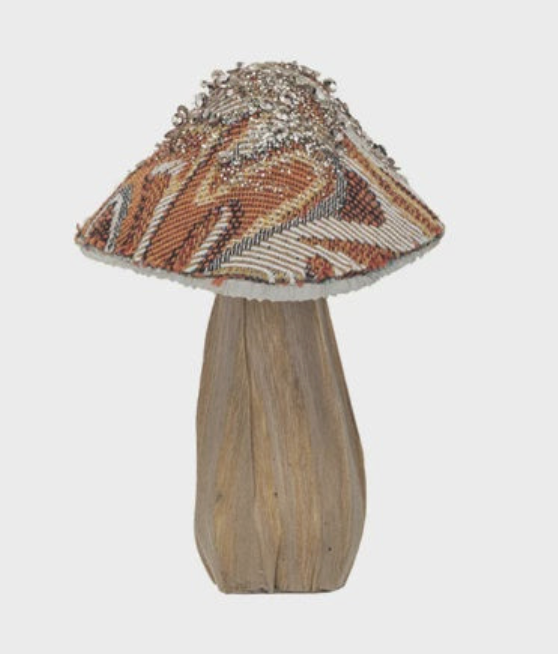 This fabric-topped foam mushrooms are a delightful and enchanting accessory that can enhance the home. It features fabric-topped foam mushrooms with a wood base, sequins, and glitter, a multicolor body, and a round shape, giving them a colorful and shiny look.