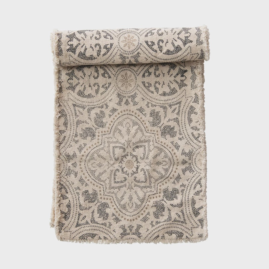 72"L x 14"W Cotton Printed Table Runner w/ Frayed Edge, Grey & Cream Color