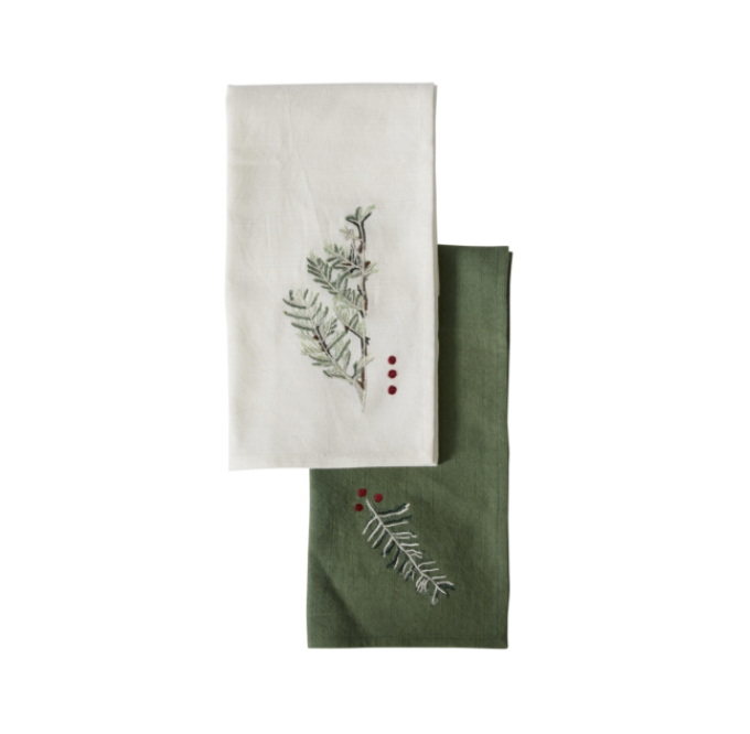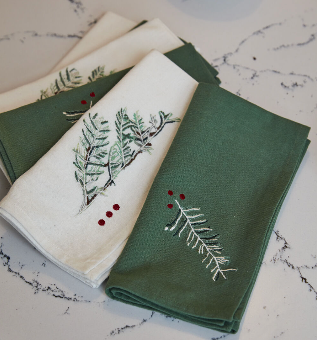 Après-ski, gather around the table & warm up with a hearty meal. This set of four stunning white linen Alpine Napkins features delicate embroidered greenery & holly berry details & adds a festive, wintry touch to the dinner table during the holidays.