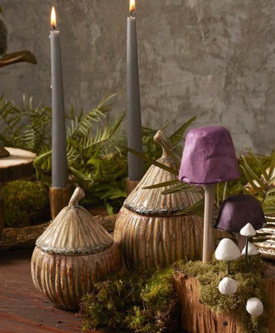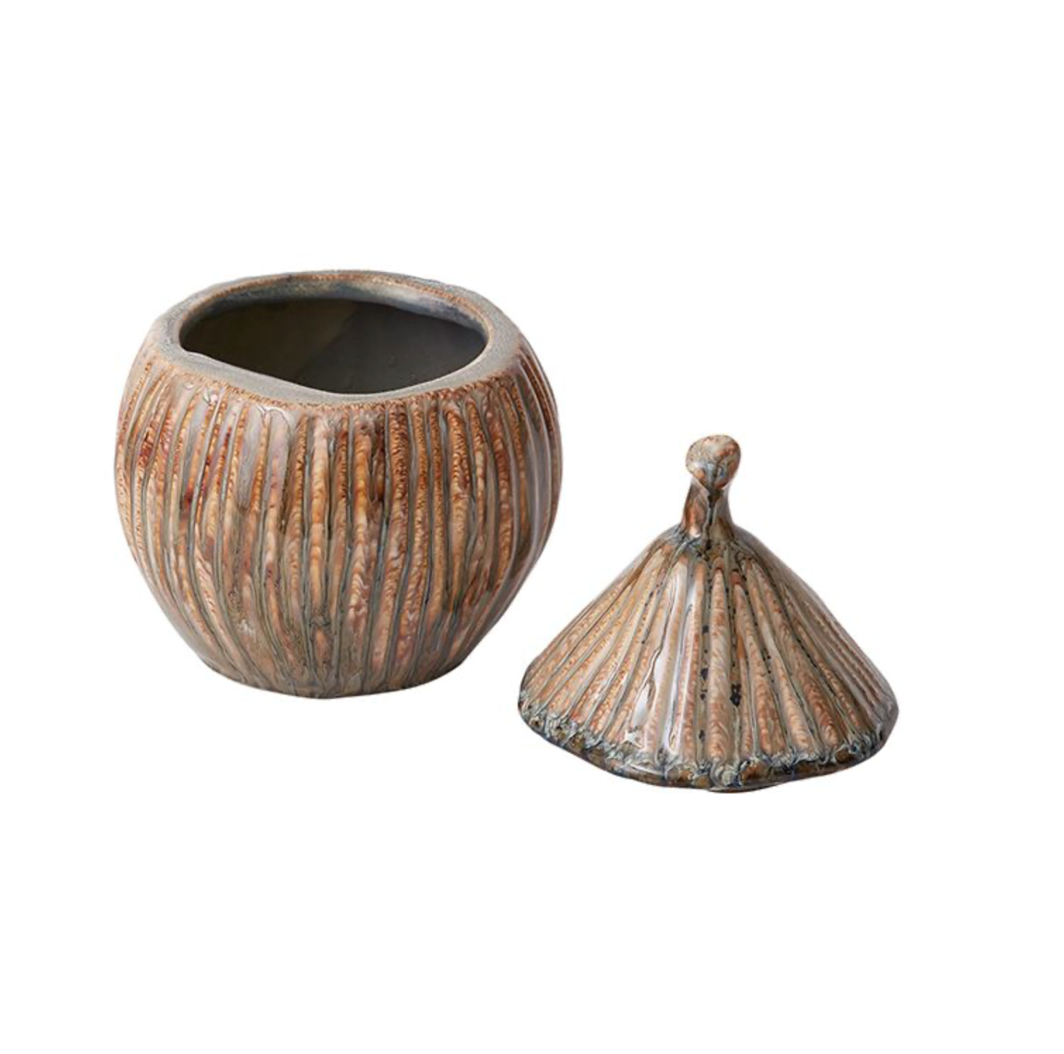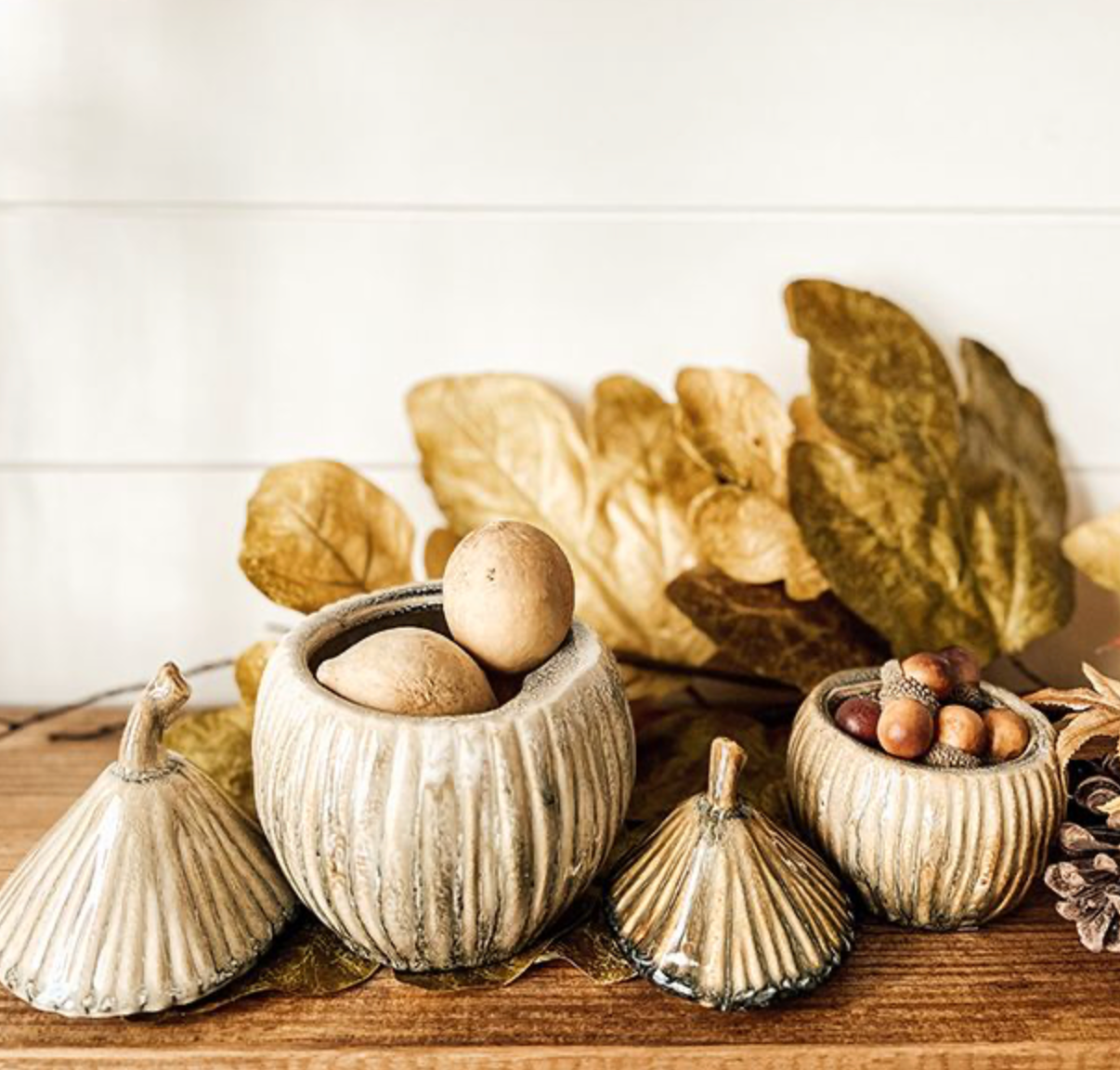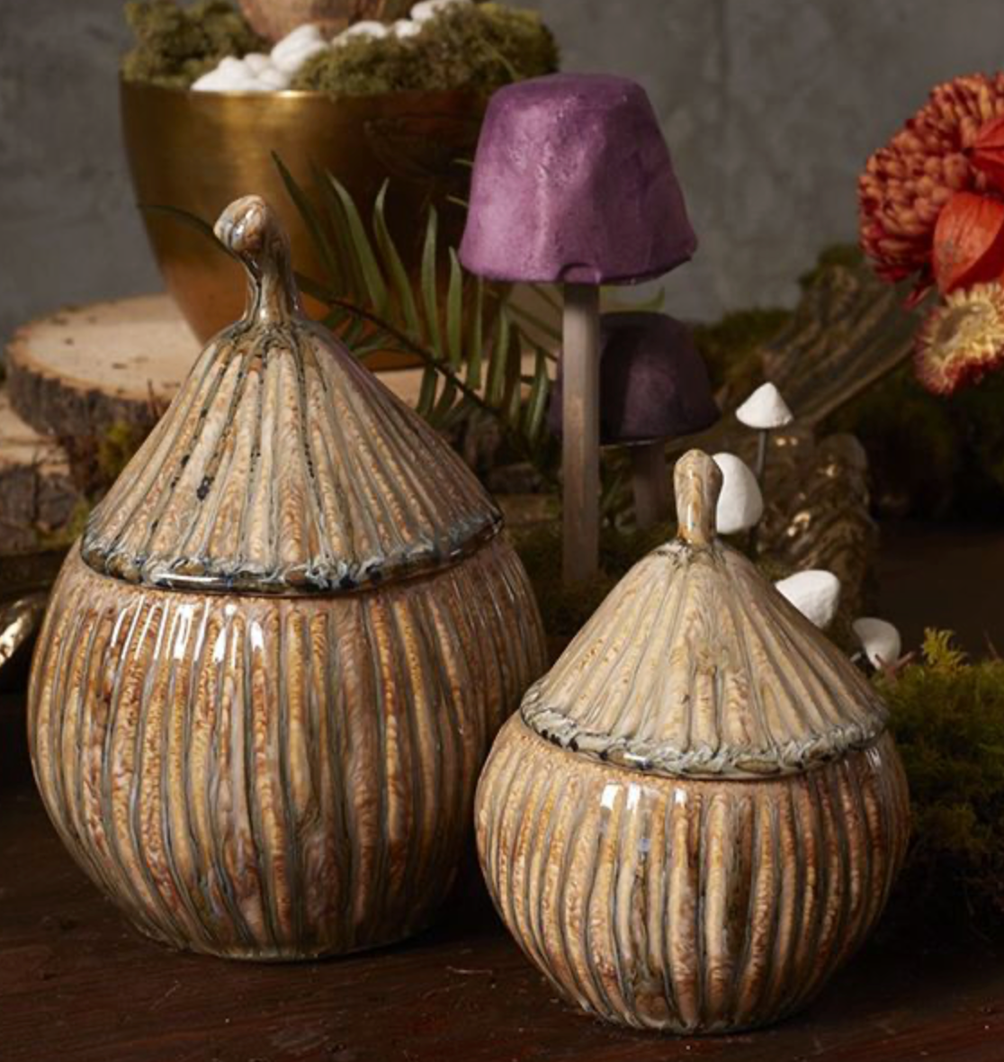 Adorn the harvest table with Autumn Canister, nature inspired acorn ceramic containers. Ceramic acorns have stemmed cap lids and both pieces have embossed textured and organic shiny glazes. Only one size available.