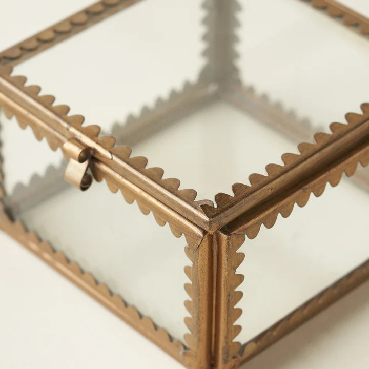 Display precious items with this brass and glass display box with scalloped edges and antique finish that features a unique design and a vintage charm. This display box is a wonderful choice for Victorian, shabby chic, or French country style home décor, as it reflects the ornate, romantic, and rustic elements in these themes. This display box is a lovely piece that can be used to store and display small items such as rings, earrings, charms, or crystals. This is made of high-quality brass and glass that reflects the beauty and style of the home décor.
