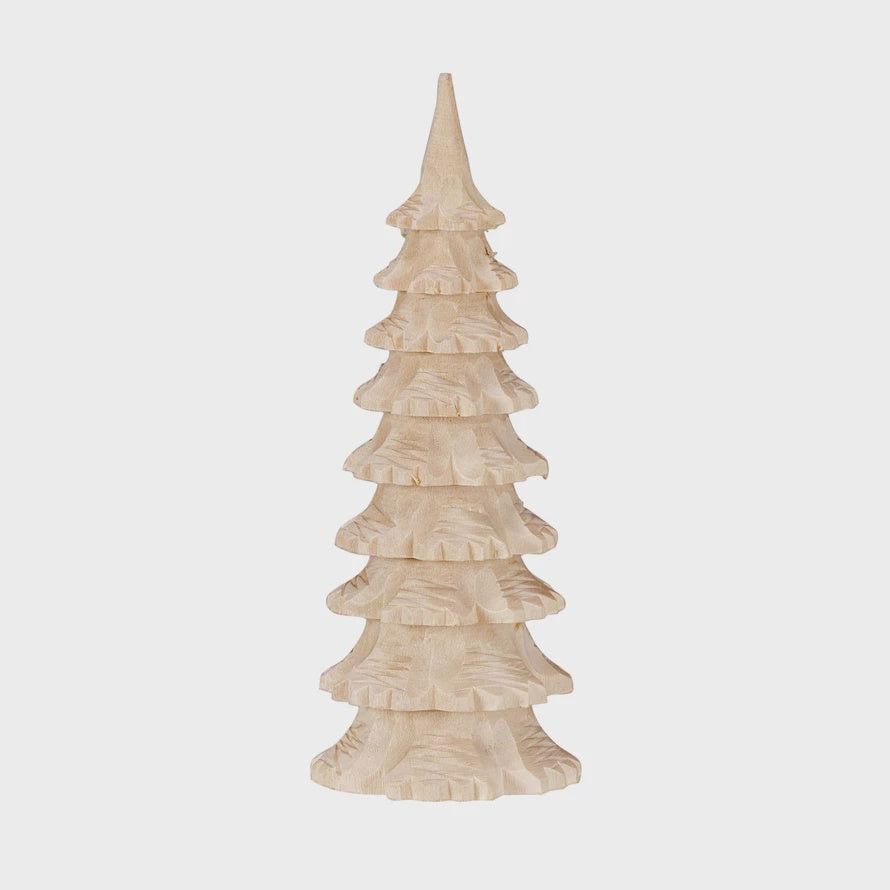 This natural, carved wood tree is a beautiful and convenient way to decorate for the holidays. It features a carved wood tree with a natural color and a cone shape that creates a rustic and authentic effect, making it look like a real tree. The tree has a solid and textured texture that is pleasant to touch and look at. The tree is ideal for displaying on a table, shelf, or mantel, where it can add a touch of nature and tradition to the space. The tree is made of solid, durable, and natural basswood, making it a great choice for holiday decoration.