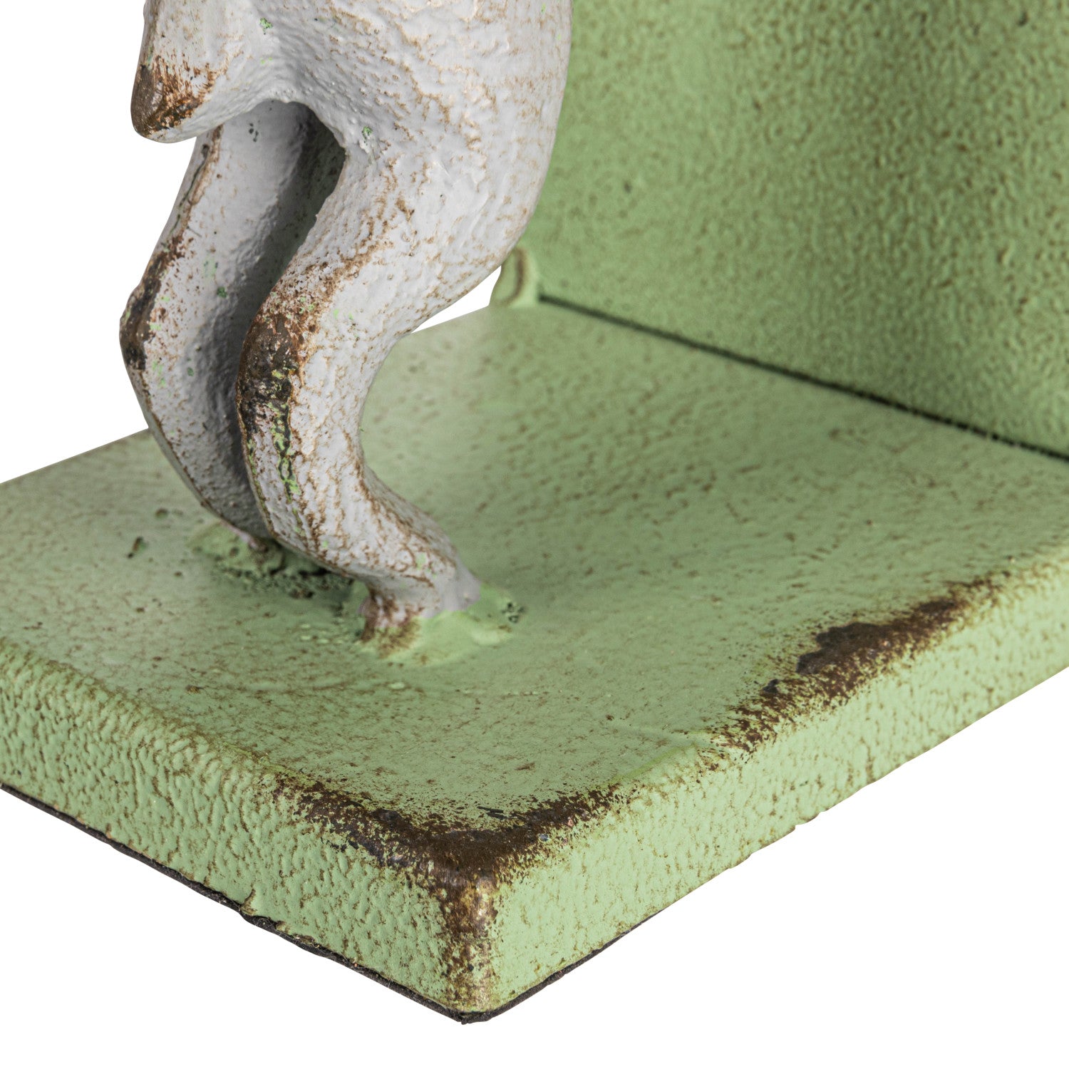 These green and grey cast metal rabbit bookends are a fun and unique way to organize and decorate the book collection. They are made of cast metal, which is a sturdy and heavy material that can hold up books of different sizes and weights. They have a rabbit shape, where each bookend is half of a rabbit with long ears and a fluffy tail. They have a two-tone distressed finish that gives them a vintage and weathered look, adding some farmhouse-inspired charm and whimsy to the home décor. They can be used as a set or separately for display. They are suitable for any cottage, farmhouse, or rustic style of home décor, as they complement any color scheme and material. They are great for animal lovers or book enthusiasts. Each bookend measures 4.5 inches long, 3.5 inches wide, and 5.75 inches high. To maintain their beauty, wipe them with a dry cloth. These bookends are a versatile and stylish addition to any home. Add some farmhouse-inspired charm and whimsy to the bookshelf with these green and grey cast metal rabbit bookends. These bookends are suitable for any cottage, farmhouse, or rustic style of home décor, as they create a cozy and playful look. Features a rabbit shape, perfect for displaying books in the living room, office, or bedroom.