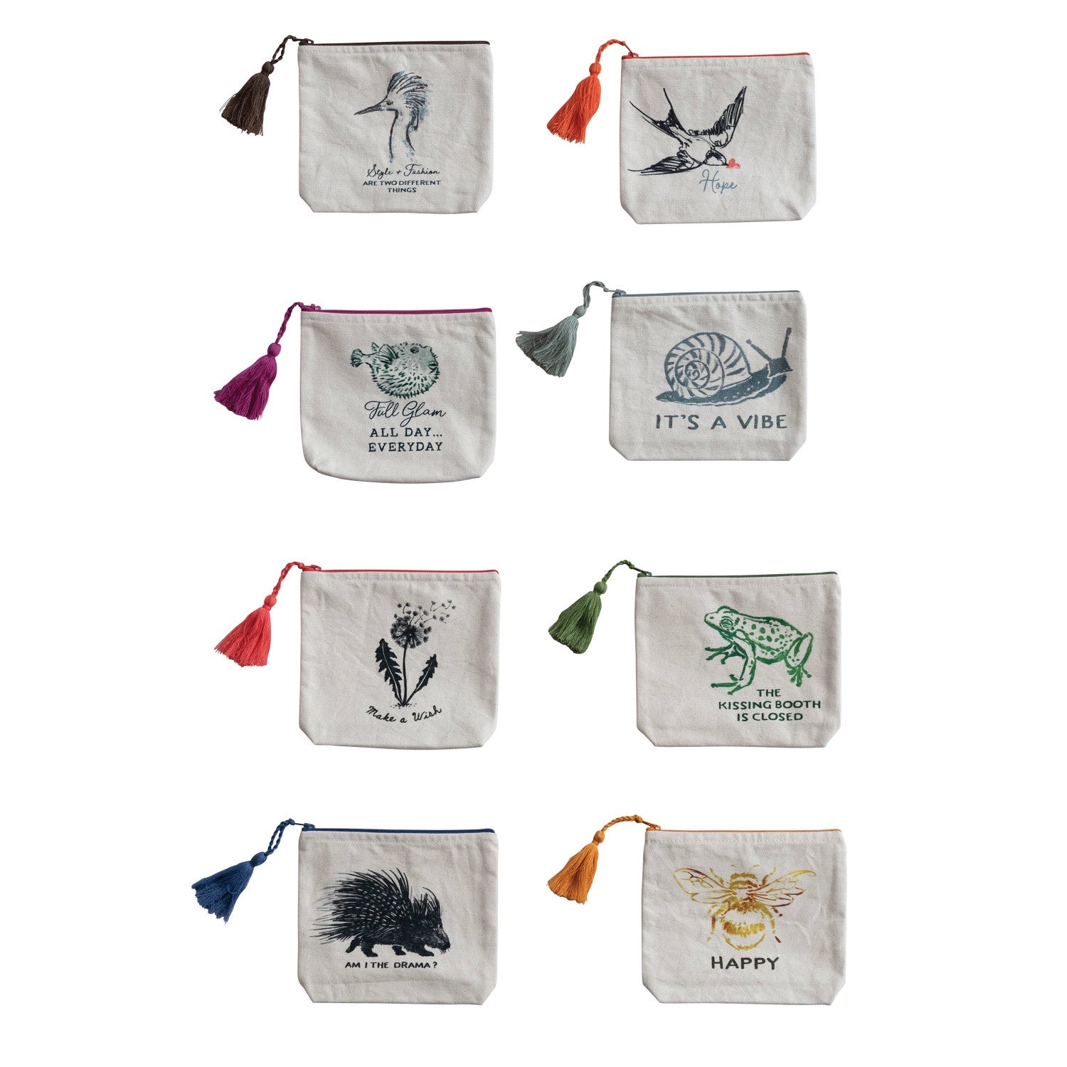 Cotton Printed Zip Pouch w/ Saying, Image & Tassel