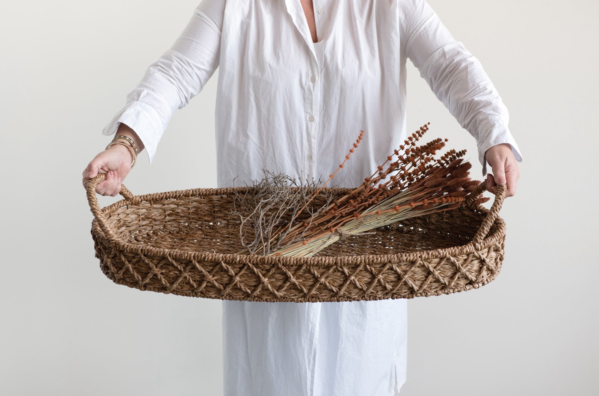 Make this seagrass tray a statement piece in the living room or bedroom of your home. Fill it with dried botanicals and a selection of books to display on the coffee table or oversized ottoman. In the bedroom, place in the middle of the bed and display a decorative "breakfast tray" setting with small plate, cup and saucer and small vase with a single flower inside.