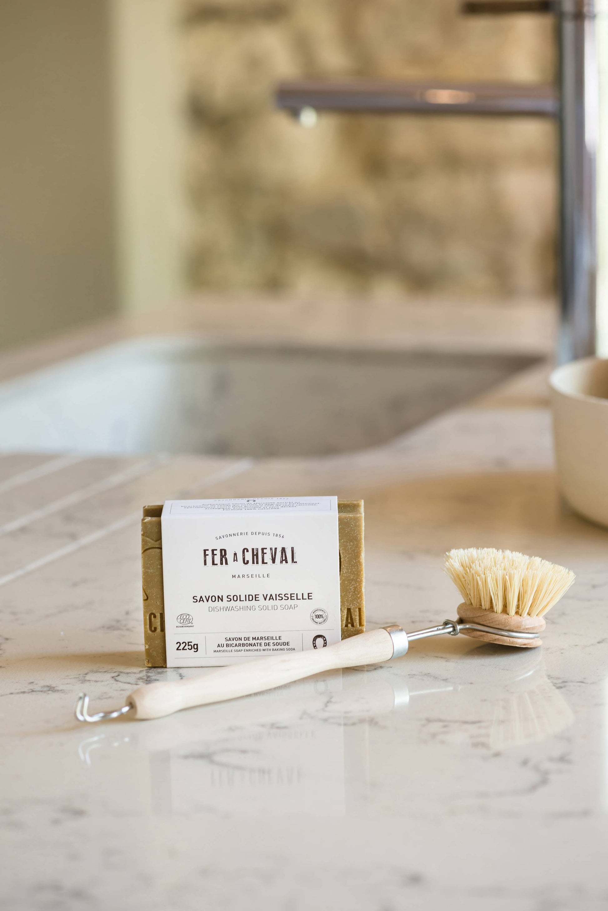 Solid Dish Soap based on Marseille Soap cooked in a cauldron and enriched with Sodium bicarbonate. Labeled Ecodetergent*, our Solid Dish Soap effectively cleans and degreases your dishes and cutlery. An alternative to dishwashing liquid, more economical and ecological. 100% natural origin, without colourings, preservatives and perfumes. Dampen your sponge or dish brush, rub it directly on the soap, clean your dishes, rinse and dry.