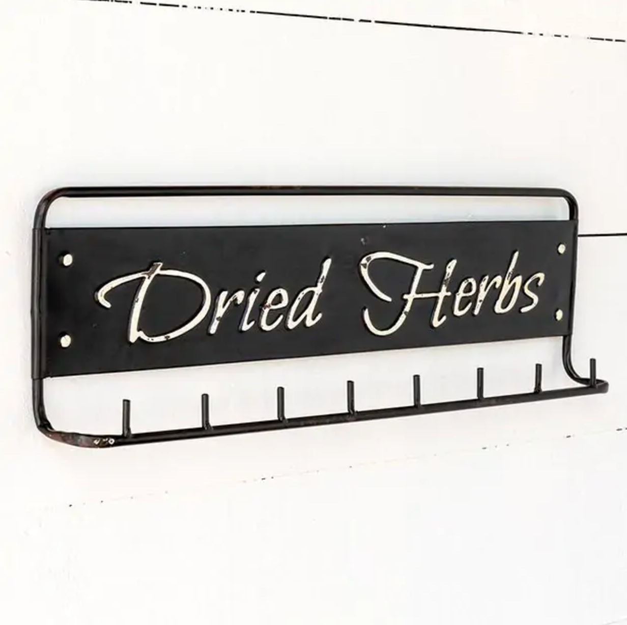 This vintage inspired Dried Herbs sign features embossed letters and a black aged paint finish. The hooks allow multi-use from hanging your favorite dried flowers to keeping track of keys.