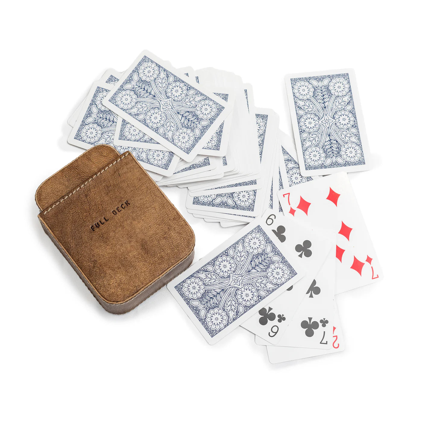 Carry your cards in style with this sleek and sophisticated Brown Leather Card Case featuring a full deck of playing cards and the quote "Full Deck". Made from high-quality leather and durable materials, this card case protects your cards while also adding a touch of personality to your game nights.