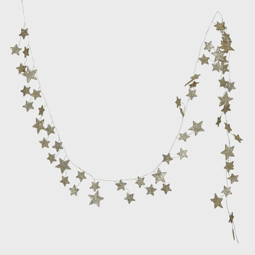 This captivating gold glitter star garland adds a touch of festive cheer and elegance to any holiday décor or special occasion. Sparkling gold glitter stars catch the light beautifully, creating a dazzling display that adds a touch of shimmering magic to every decoration. Made from glittery paper, these stars offer a lightweight design that's easy to drape over Christmas trees, mantels, railings, or anywhere to add a touch of festive cheer.
