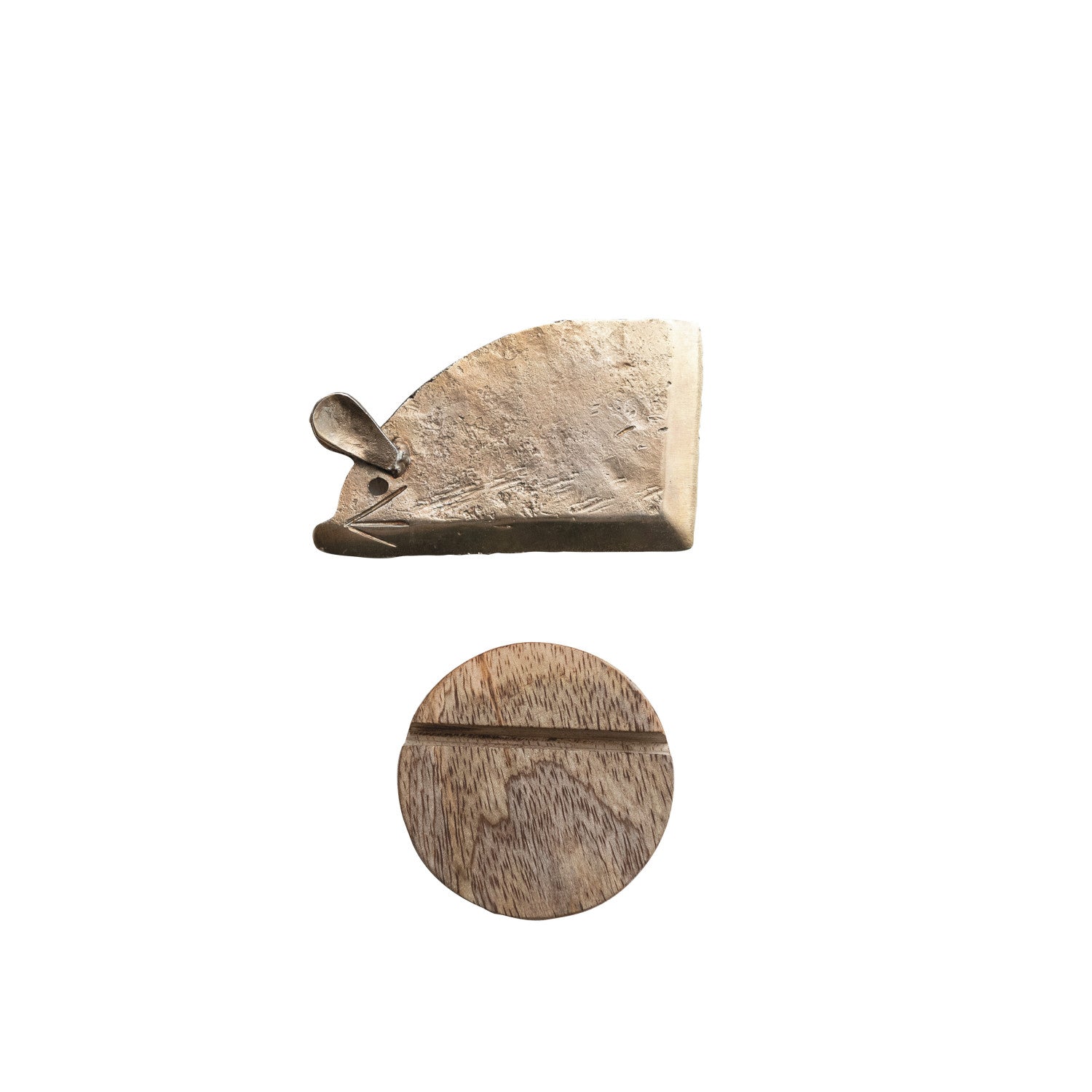 4"L x 2-1/4"W Hand-Forged Metal Mouse Shaped Cheese Knife w/ 2-1/2" Round Mango Wood Stand, Antique Brass Finish & Natural, Set of 2