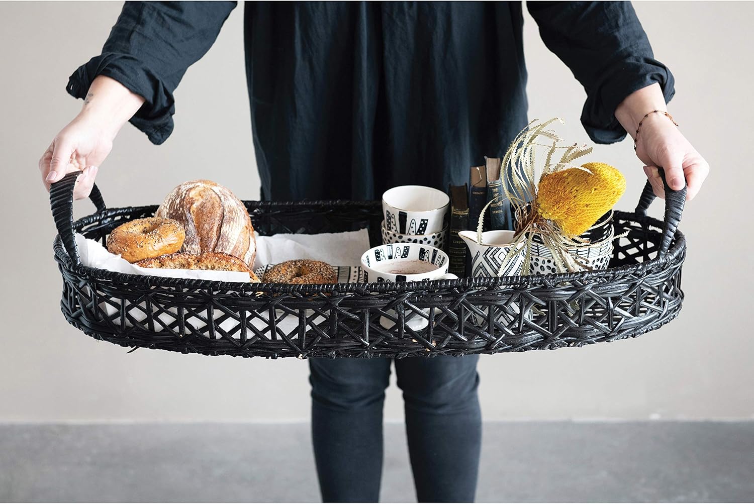 These trays are perfect for kitchens, coffee tables and entryways. Hand-woven, these trays are made out of rattan and feature a simple black color that will match with anything. Perfect for filling with decorative books, keys and other personal belongings, and small plants.