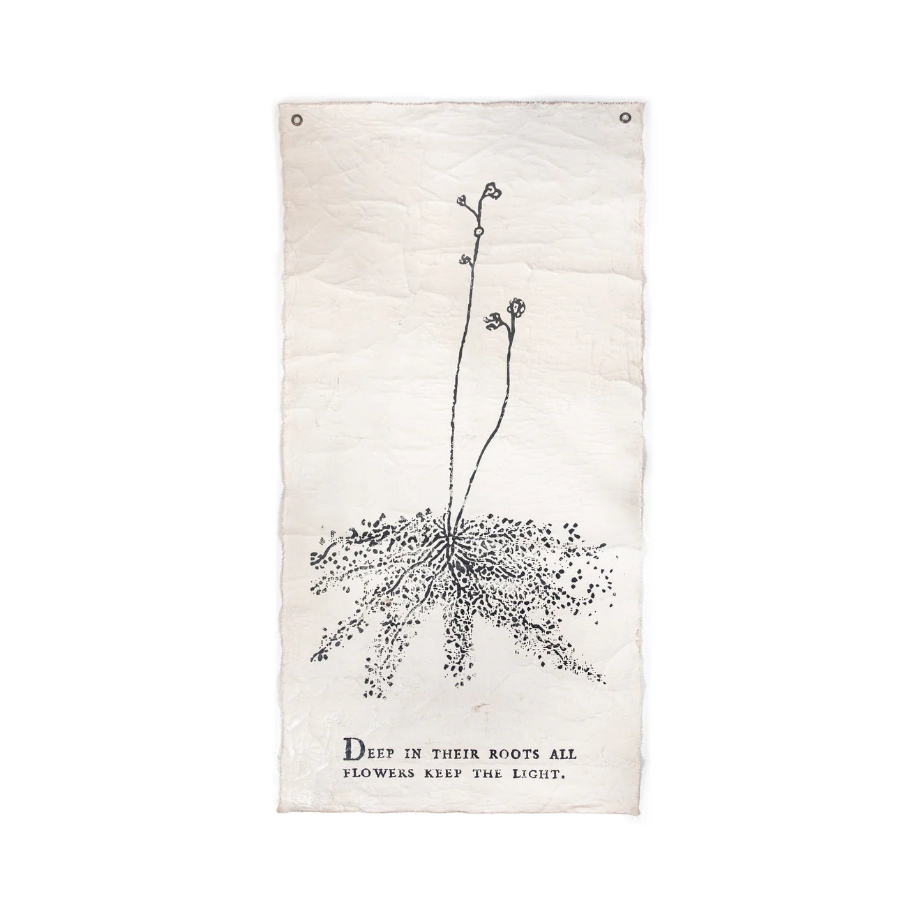 These botanical tarps are based off of Rebecca's love of anything that grows from the earth, mixed with meaningful words. The handmade nature of these crackled tarps make them a casual relaxed way to introduce nature into a home while covering a lot of wall space. Each tarp comes with grommets at the top to use for hanging. We recommend using our hand forged metal nails.