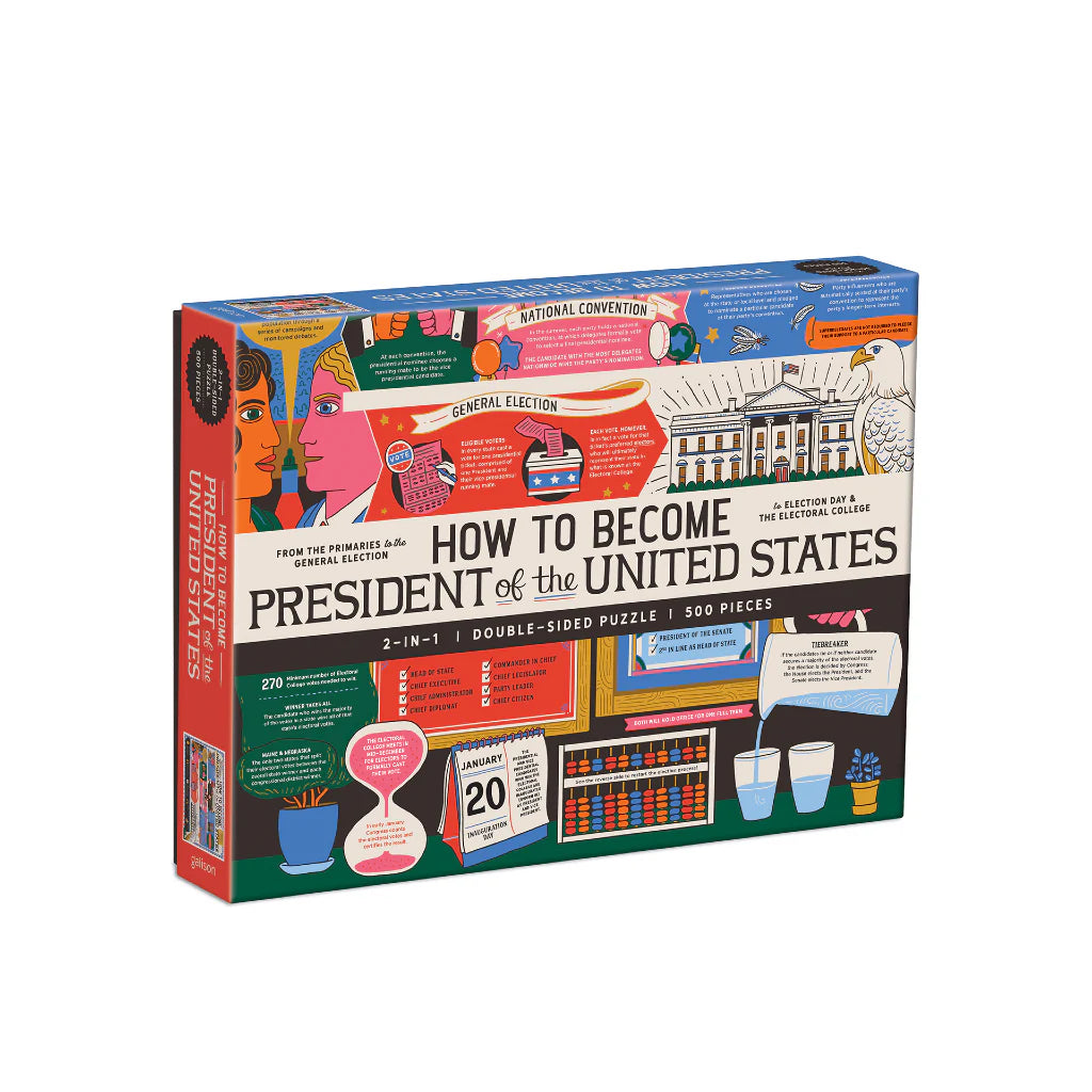 Galison How to Become President of The United States– 500 Piece Double Sided Puzzle Featuring Illustrations About The Presidential Election and Electoral College