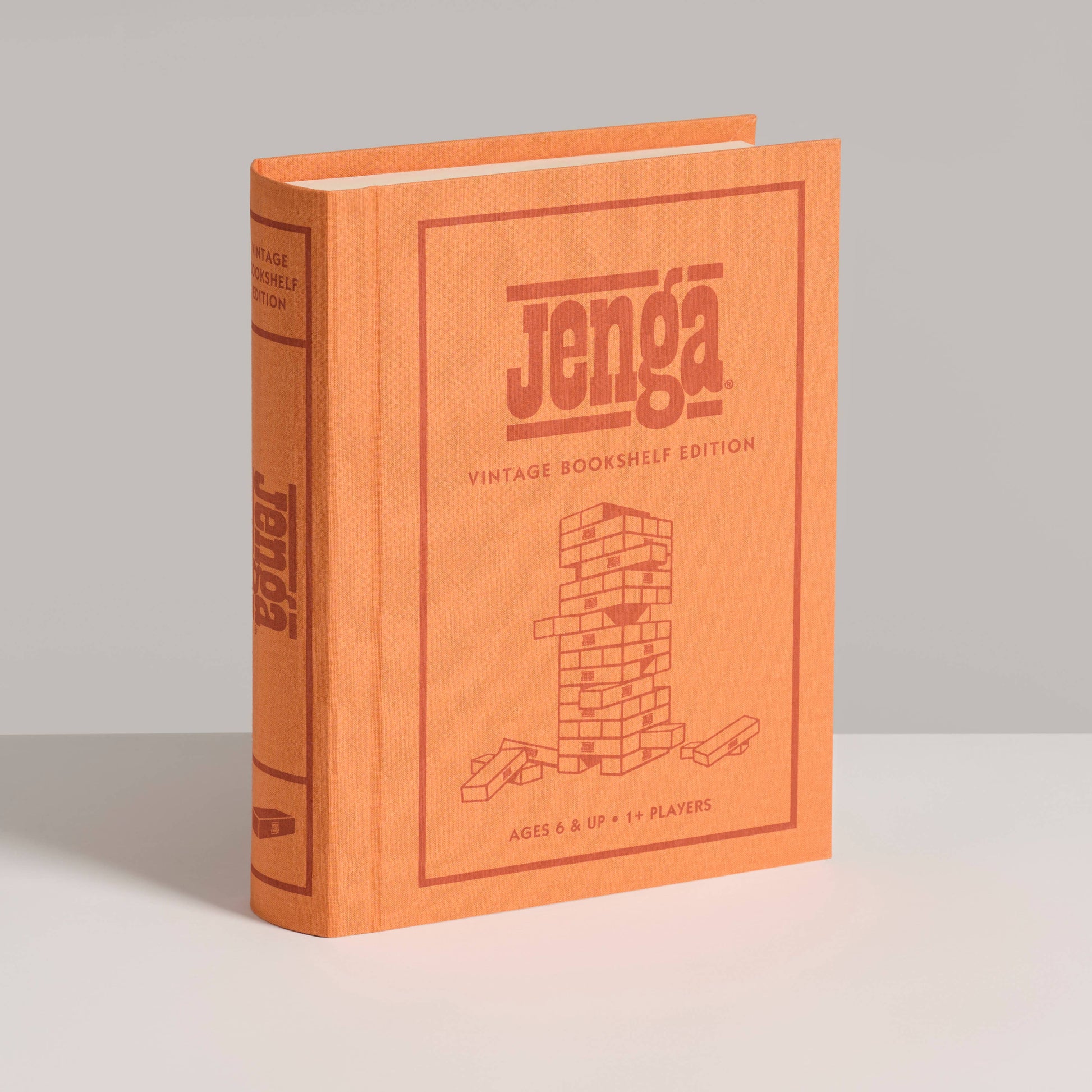This Vintage Bookshelf Edition JENGA brand game will make family game night exciting and fun! How tall is too tall? You will find out when the tower falls. Your JENGA game requires dexterity and strategy that will have people on the edge of their seats. Pull the block, stack it on top, and hope the tower doesn’t crash down! Fabric-wrapped book with integrated storage, 54 hardwood blocks inspired by the 1986 edition, and stacking sleeve.