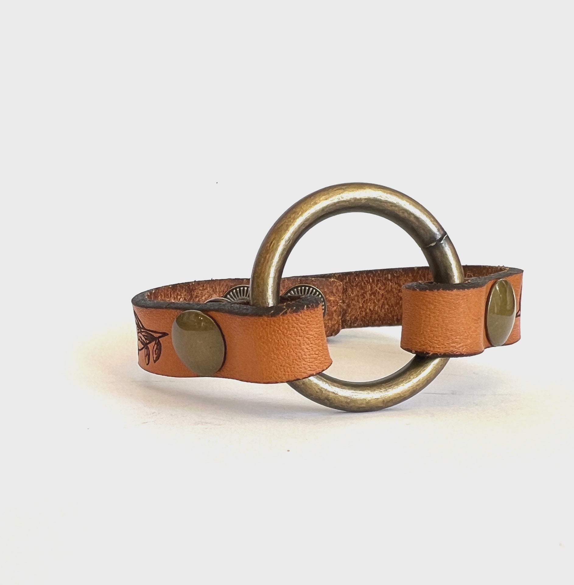 This bracelet cuff is made from premium, full grain leather from our local leather shop. We hand select each hide for quality. Your bracelet is then laser cut, and finished with solid brass snap for a long lasting touch. It's comfortable and lightweight, making it great for everyday wear. Each piece of leather is different, please allow for slight differences in appearance, making each one unique.