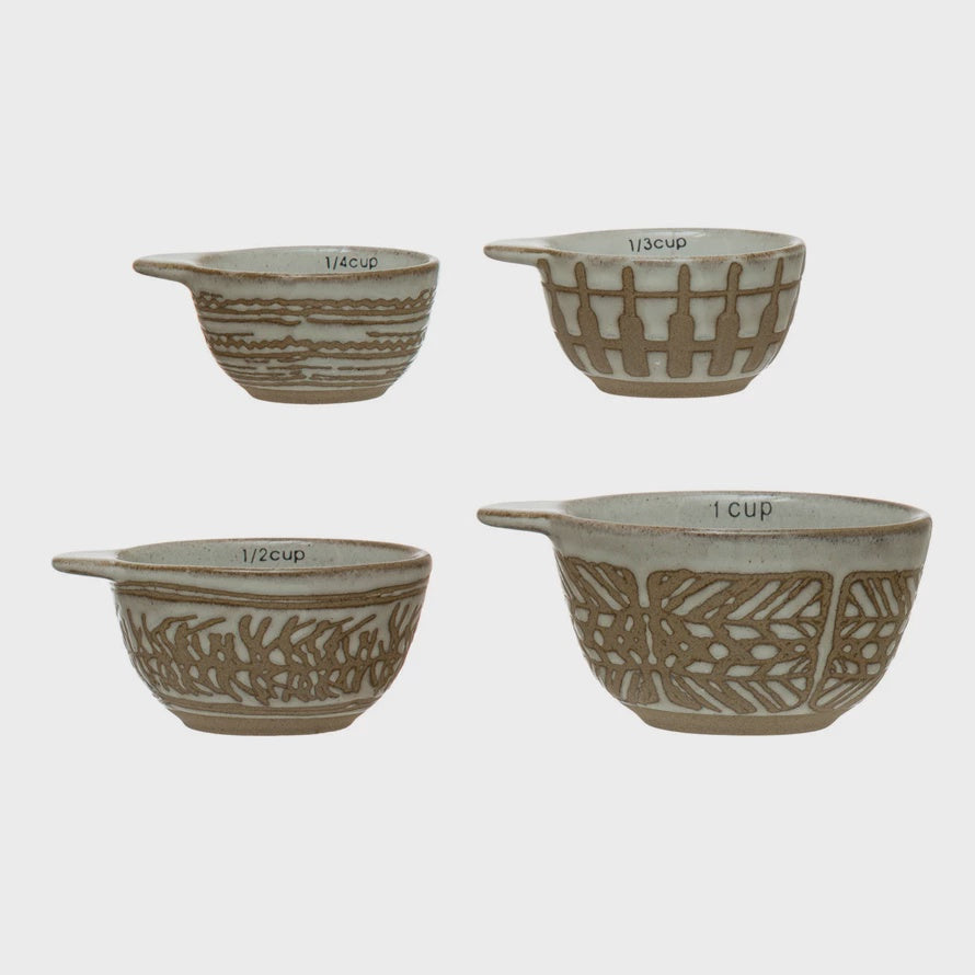 These measuring cups are a beautiful addition to any kitchen. Made out of stoneware, these cups have a white wax relief pattern that make these baking stylish and sophisticated. Comes in a set of 4