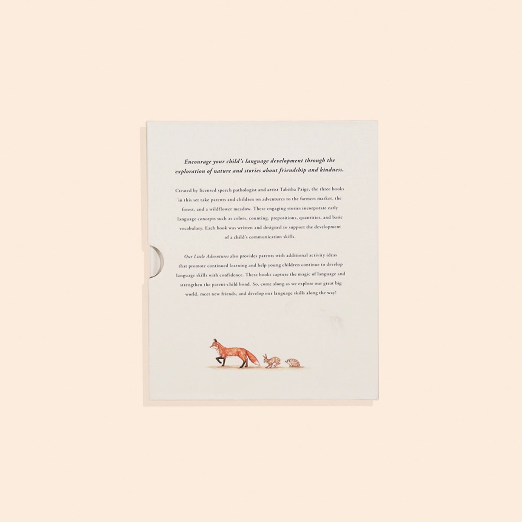Stories Featuring Foundational Language Concepts for Growing Minds. Jump-start your young child's education with vocabulary and early language concepts using this beautiful board book set to help build your child's language skills and encourage them to explore nature. Tabitha Page, Licensed Speech Pathologist and Watercolor Artist takes your child on three different trips through nature in this book set.