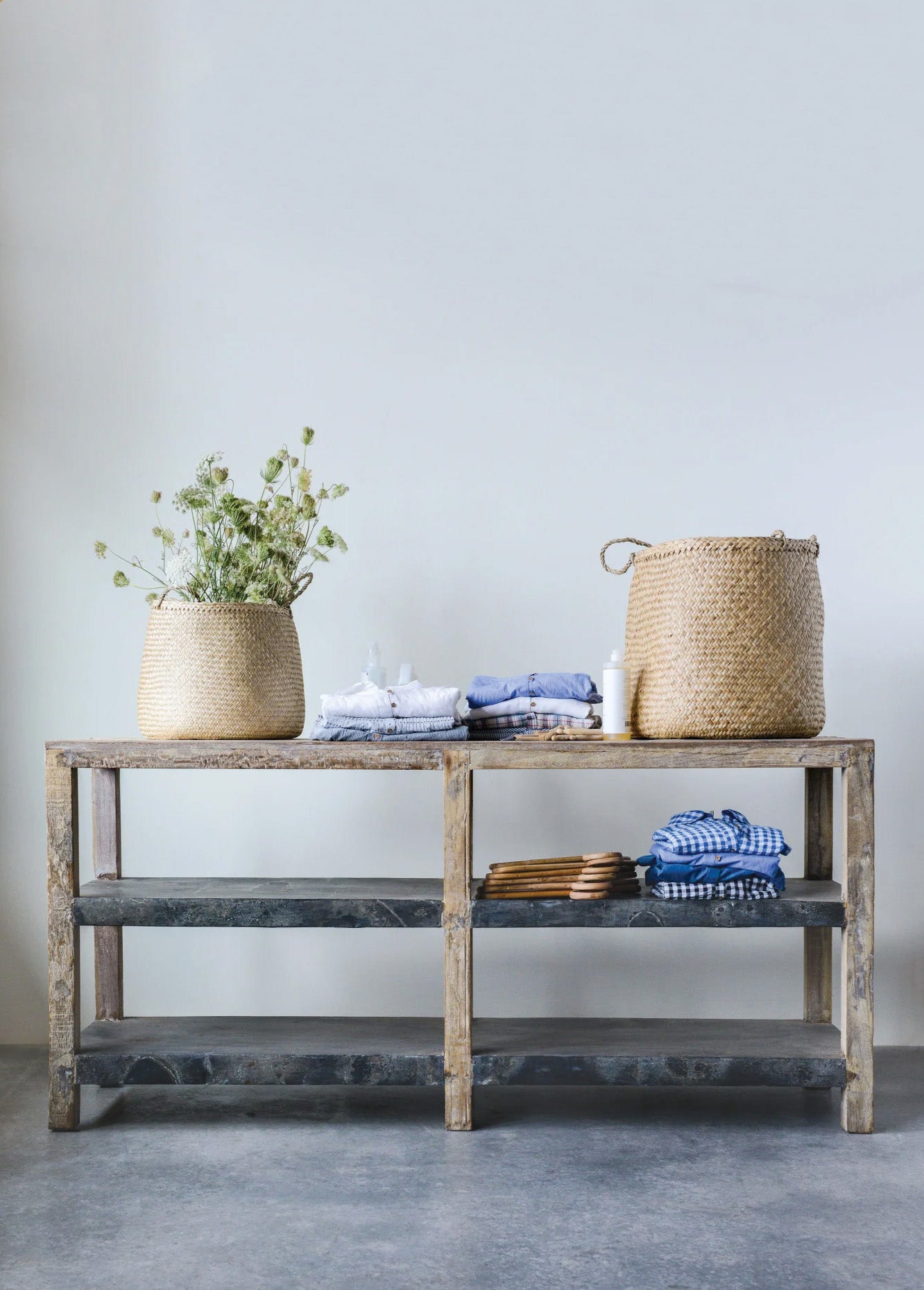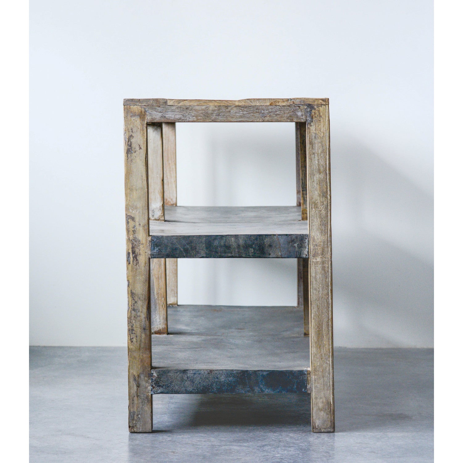 Reclaimed Wood & Metal Clad Credenza w/ 2 Shelves, Distressed Zinc Finish.