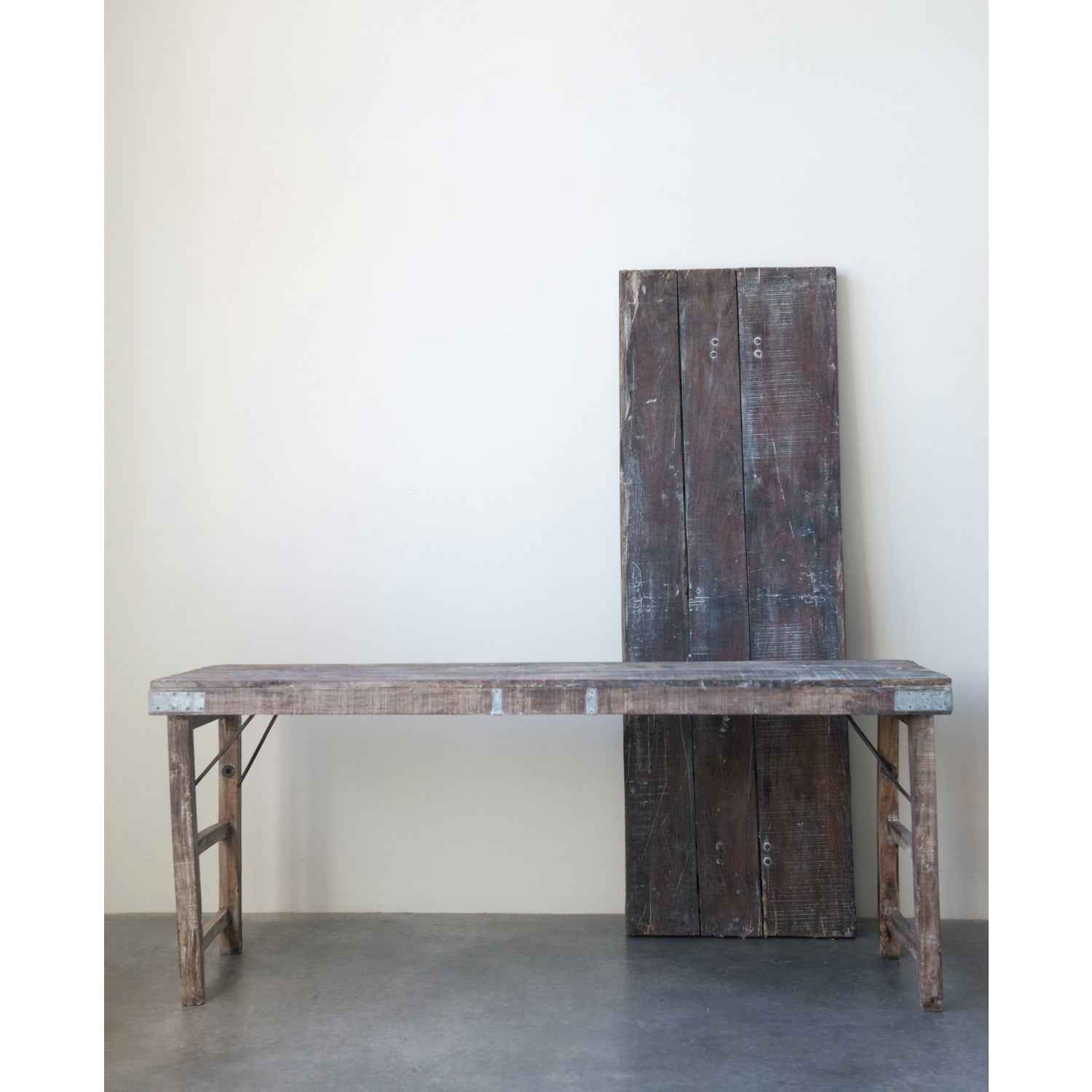This one of a kind folding table will draw amazement from whoever comes near it. The heavily distressed table is made with pieces of Indian reclaimed wood that were part of river boats from local river villages. Because reclaimed wood pieces are each unique, no table will ever have the same finish.