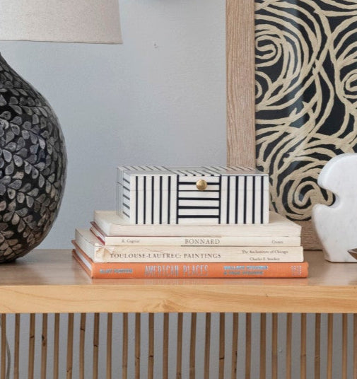 Store small items in style with this resin box. This piece is made of resin, a durable and lightweight material that mimics the look and feel of ceramic. It features a striking striped block pattern in black and white that adds a touch of sophistication and contrast to the space. The knob is made of metal with a gold finish that adds a touch of elegance and shine. This piece is designed to store small items such as jewelry, accessories, keys, or coins. Place them on a dresser, vanity, nightstand, coffee table, or anywhere a stylish storage solution is needed. This piece measures 8 inches in length, 6 inches in width, and 2.75 inches in height. It has a spacious interior that can hold various small items. This piece is ideal for a contemporary, glam, or geometric home décor. A chic and modern resin plastic box that features a striking striped block pattern and a gold knob for easy opening and closing. This piece is ideal for a contemporary, glam, or geometric home décor, adding a touch of sophistication and contrast to the space. This resin box is a perfect place to store the jewelry, accessories, keys, or coins, and to add some style to the dresser, vanity, nightstand, coffee table, or any other spot in the home. This resin box has a ceramic-like appearance and texture, and a metal knob with a gold finish that gives it a touch of elegance and shine.