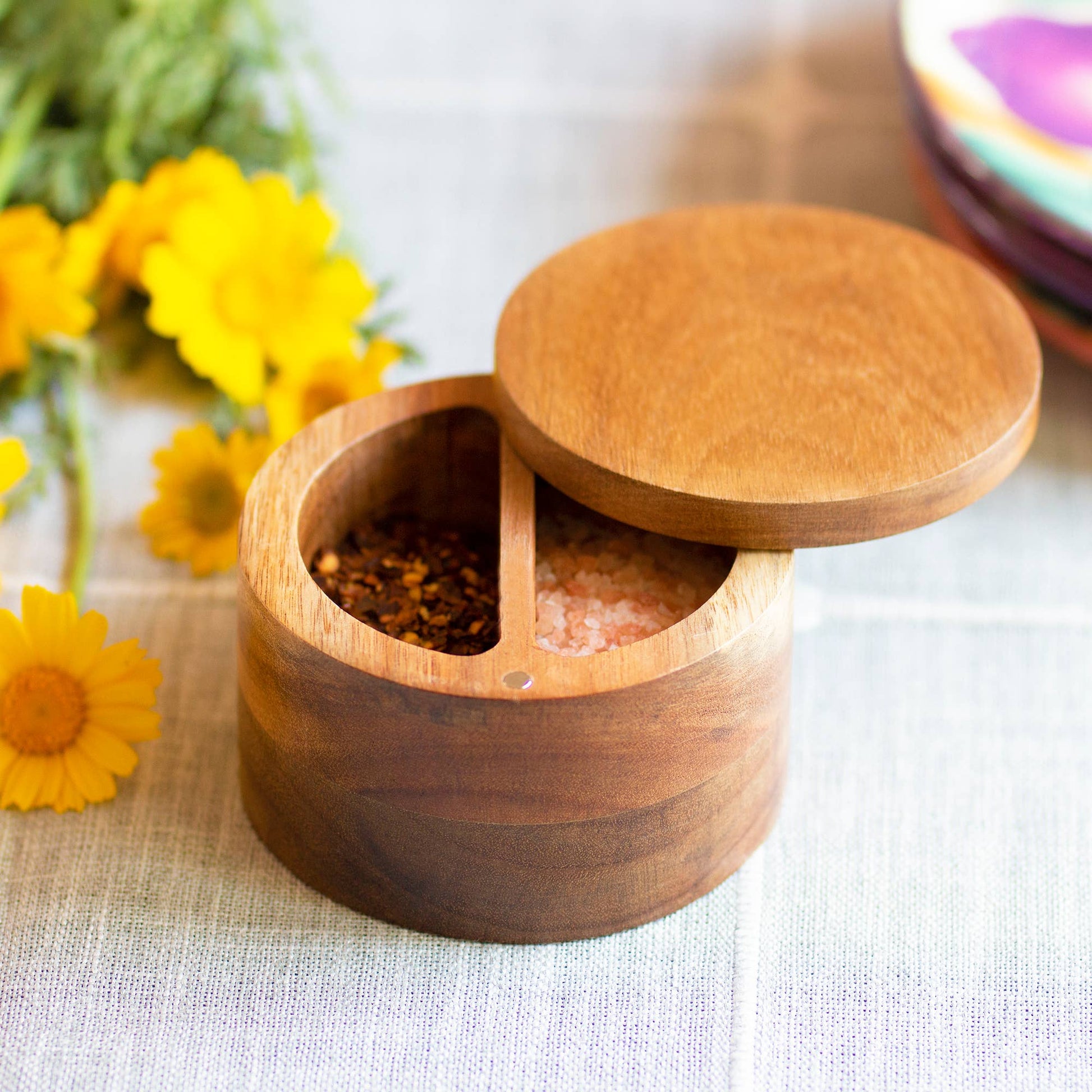 Acacia Duet Salt Cellar offers the convenience of the popular salt boxes with twice the seasonings! Whether it's used for salt and pepper or any other flavor combination, your shoppers will appreciate its utility. The beautiful acacia construction looks great on the countertop, the grill or the dining table.