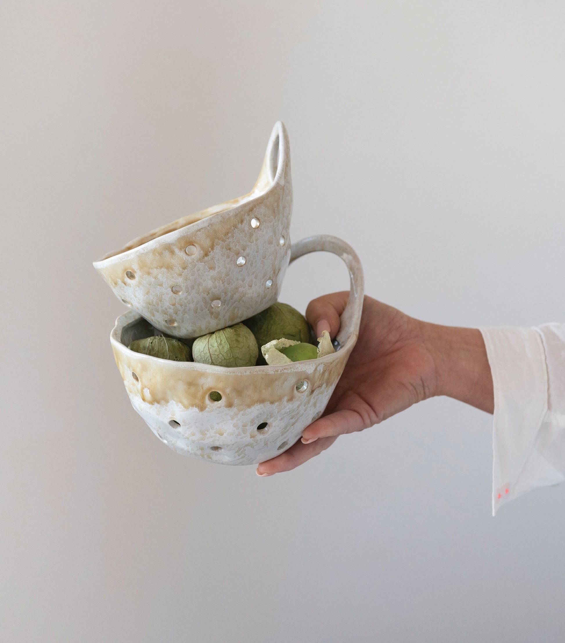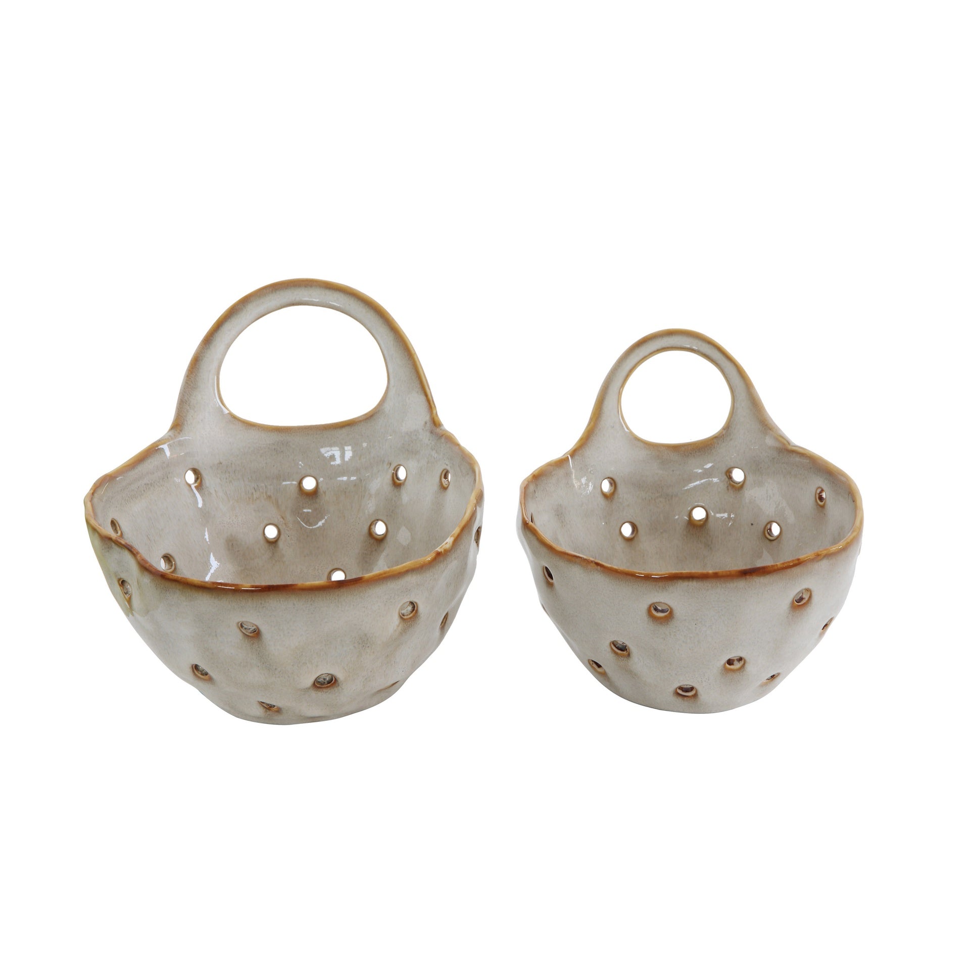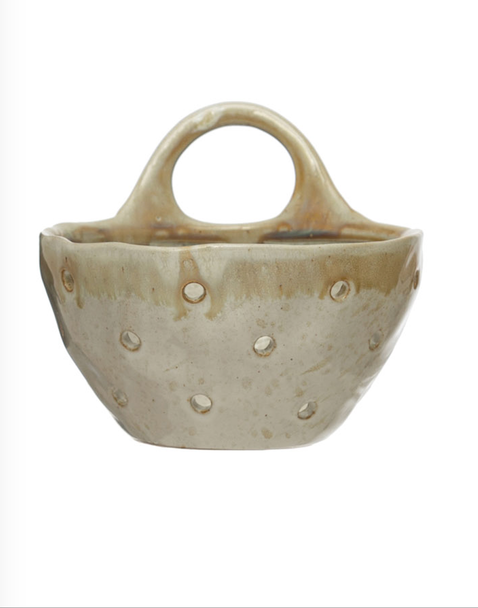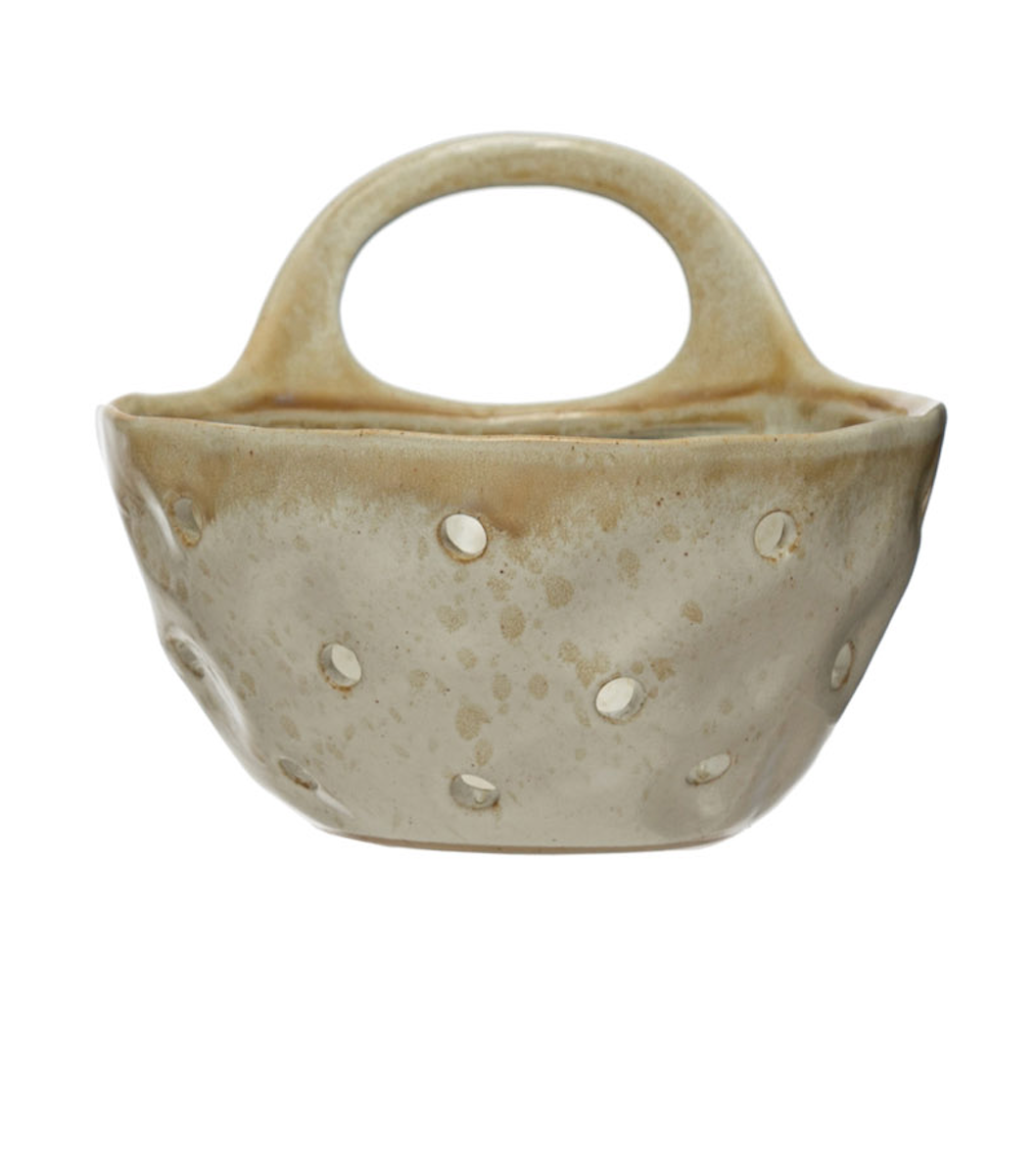 These beautiful stoneware colanders are great for the kitchen. Place them on the counter or shelf will a potted plant or various items. The neutral finish will compliment any color scheme.