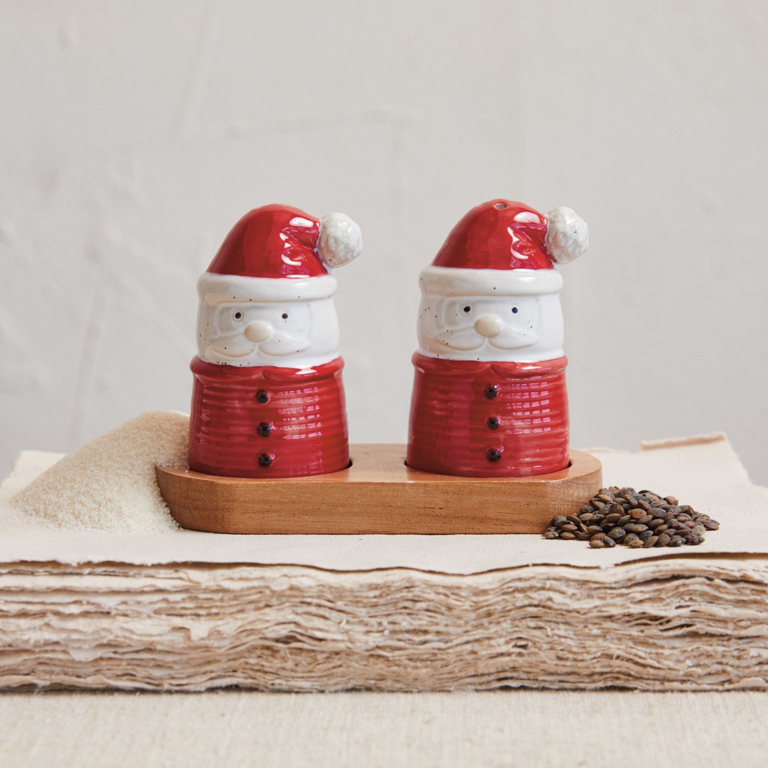 Stoneware Santa Shaped Salt & Pepper Shakers w/ Acacia Wood Tray