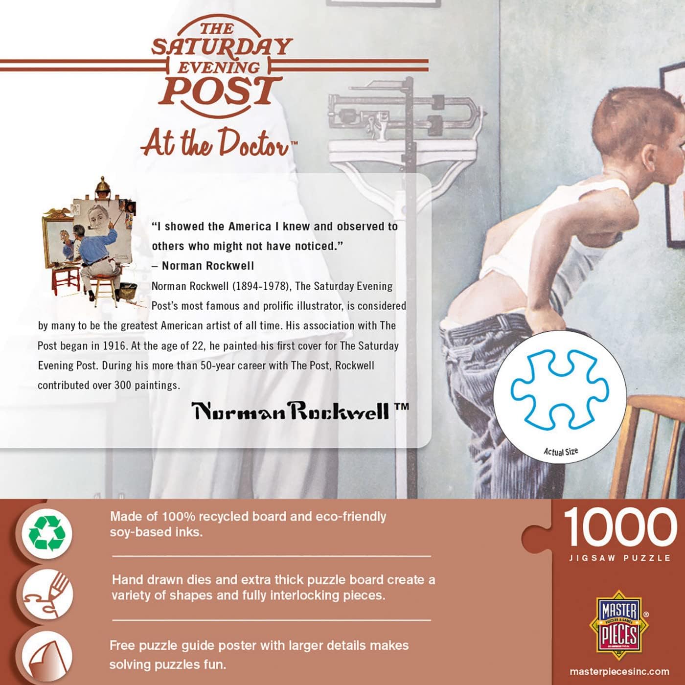This MasterPieces Norman Rockwell - Saturday Evening Post 25" x 25" 1000pc Puzzle is sure to become a family favorite. Norman Rockwell began his career in 1916 with The Saturday Evening Post. His heartwarming and humorous illustrations of everyday American life appeared on the cover of the magazine for more than 50 years and contributed over 300 paintings. With this adorable scene of little boy visiting the doctor's office, Norman Rockwell's Saturday Evening Post image is sure to have everyone reminiscing about the good old days. To reduce its impact on our environment, the chipboard used in this puzzle is made of recycled material.