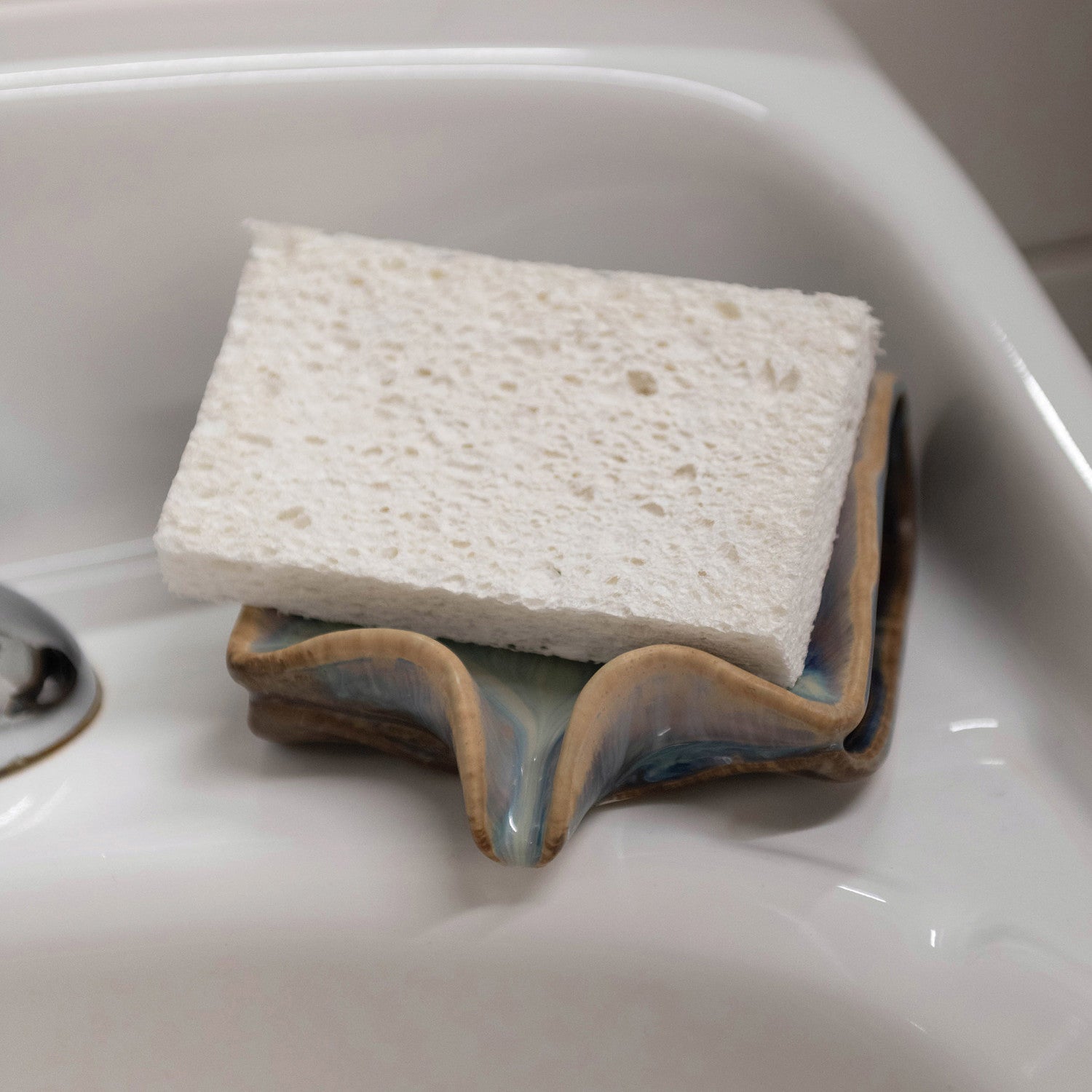 4-1/2" Square x 1-3/4"H Stoneware Sponge Holder/Soap Dish w/ Drip Spout, Reactive Glaze, 2 Colors (Each One Will Vary)