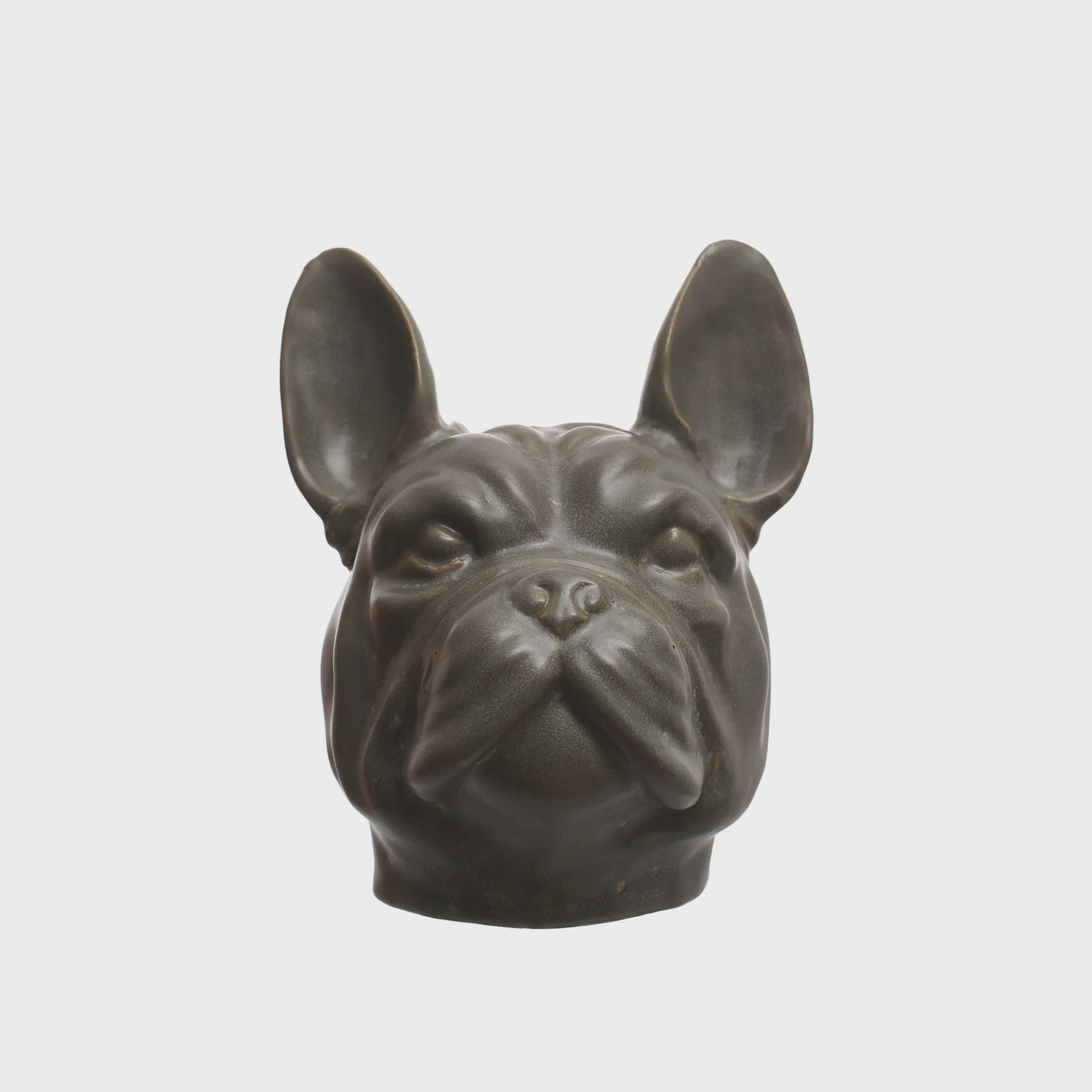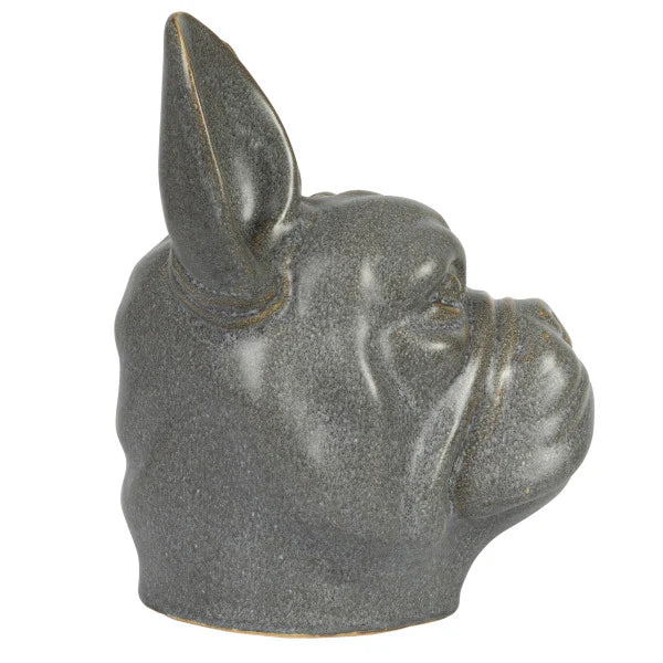 Add some fun and personality to the home with this grey stoneware French Bulldog head vase with reactive glaze is a great choice. This vase is crafted from durable and high-quality stoneware with a glossy finish that enhances its appearance and longevity. The vase features a lifelike French Bulldog head design that captures the adorable expression and features of this popular breed. The vase also has a reactive glaze technique that creates variations in color and texture, making each piece unique and eye-catching. The beautiful shade of grey complements any color scheme and adds a subtle elegance to the vase. The vase is not only visually appealing but also functional, as it can hold flowers or greenery to bring a natural touch to the decor. Display this vase on a shelf, mantel, or side table to create a focal point that will spark conversations and bring a playful charm to any interior. The vase measures 7.25 inches in length, 6.75 inches in width, and 8.5 inches in height, and an opening of 1.75 inches, making it a perfect size for any space. This is a wonderful addition to any home that loves dogs and whimsy. A unique vase that features a lifelike French Bulldog head design with a reactive glaze in a beautiful shade of grey. Perfect for dog lovers and adds a touch of whimsy to any space, especially modern, eclectic, or playful decor styles. Functional and decorative, it can hold flowers or greenery to bring a natural touch to the decor. Made of stoneware.