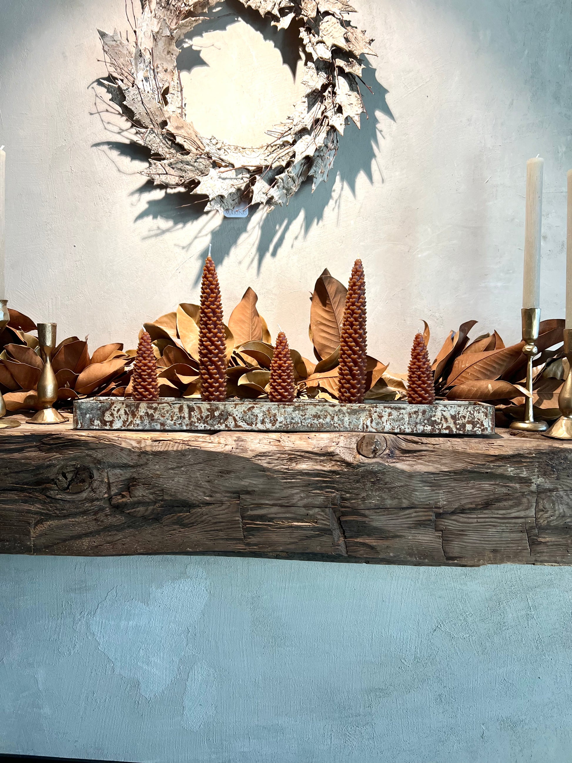 This distressed zinc taper holder tray adds a rustic, collected feel to your holiday table or mantel, perfect for creating a cozy glow with a vintage charm.