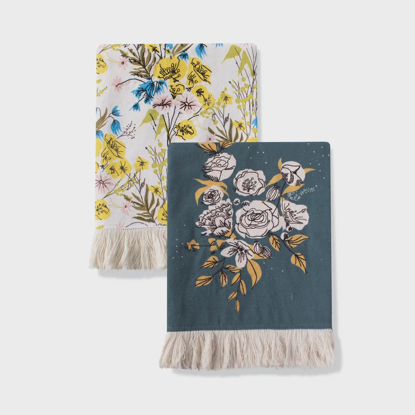 100% Cotton decorative tea towel with embroidered design accent. Folded and tied with cotton ribbon and hang tag. Hand wash and line dry recommended. 18” x 28”.