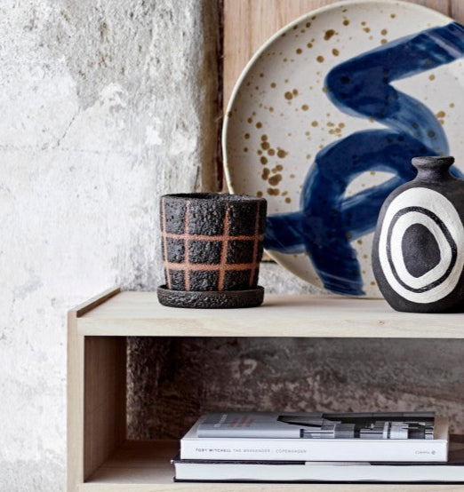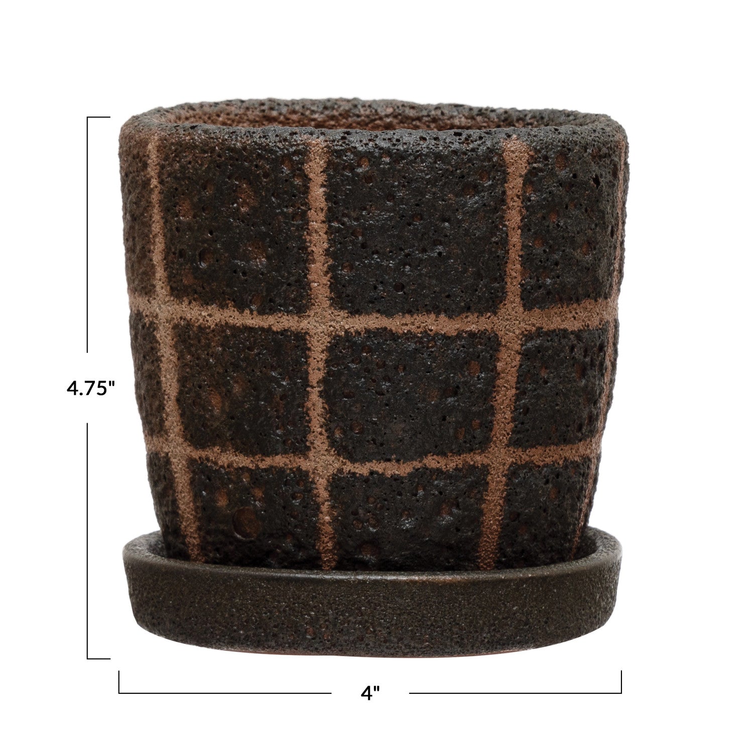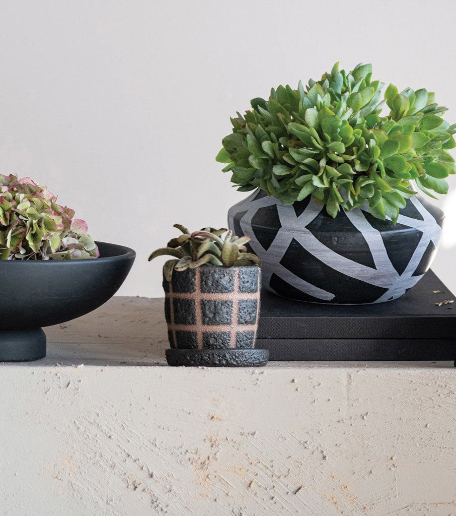 This planter and saucer is perfect for any florals or plants. Made out of terracotta, this planter features a unique brown and black grid pattern that effortlessly lends boho elements to any space.
