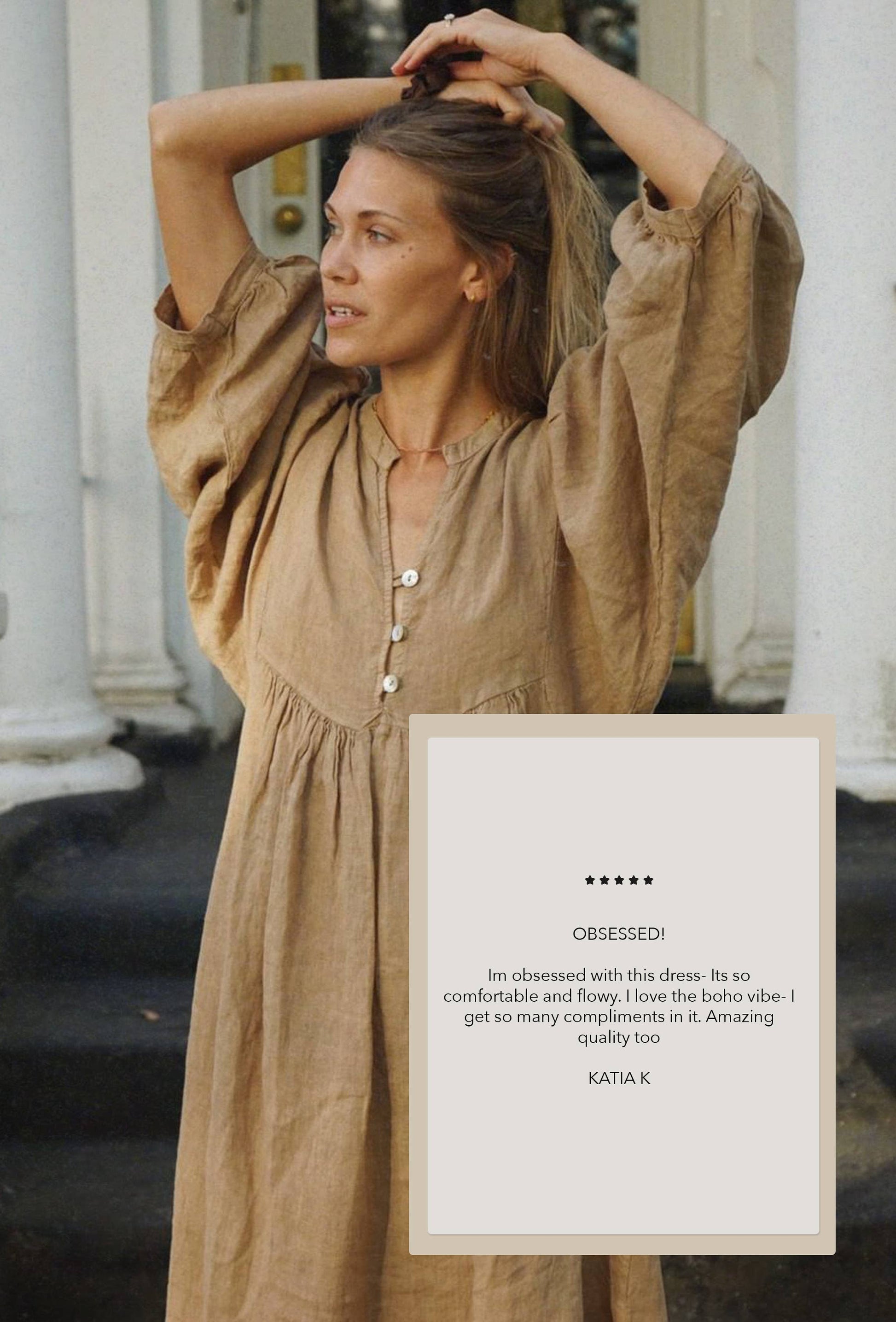Romantic & whimsical, this maxi dress features a longline silhouette, billowing puffy sleeves for the perfect, effortless look. The ultimate flowy linen dress to stay in your wardrobe for seasons to come!