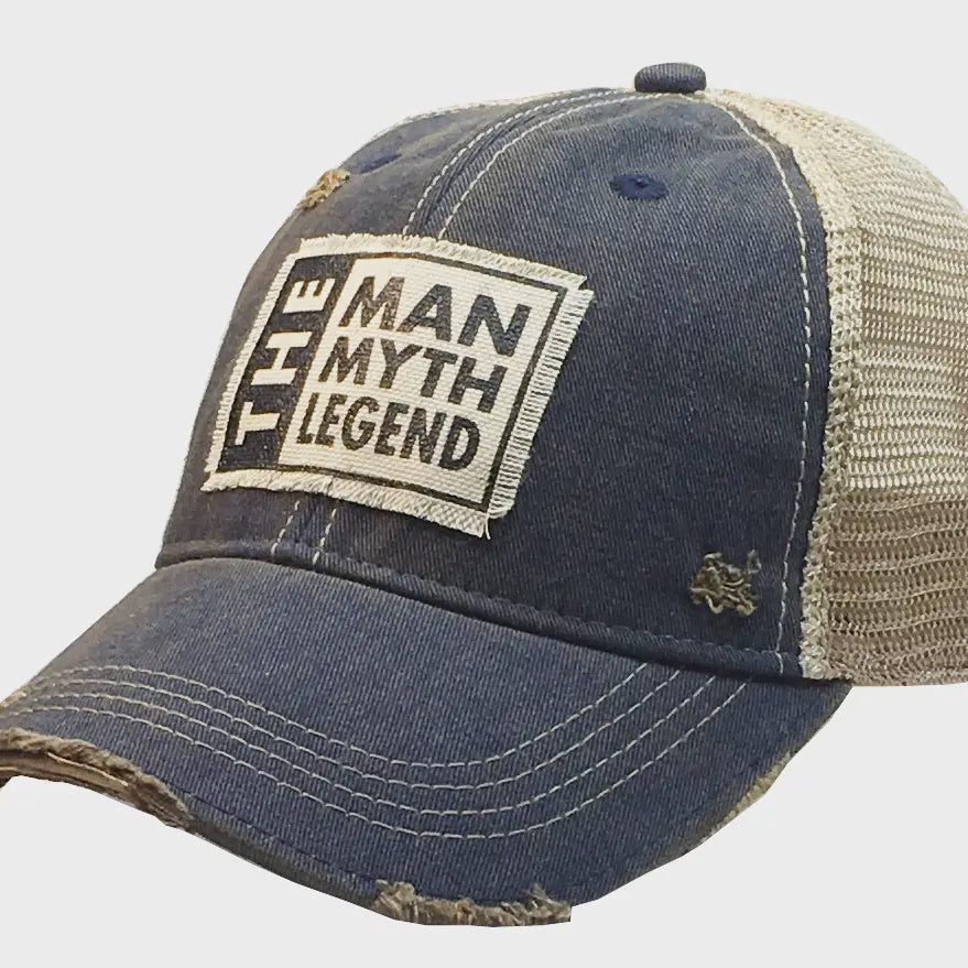 Vintage distressed trucker cap "the man the myth the legend" Color: navy blue distressed Material: cotton/polyester blend, mesh back. Size: one size fits most, with an adjustable snapback strap. Unisex cap.