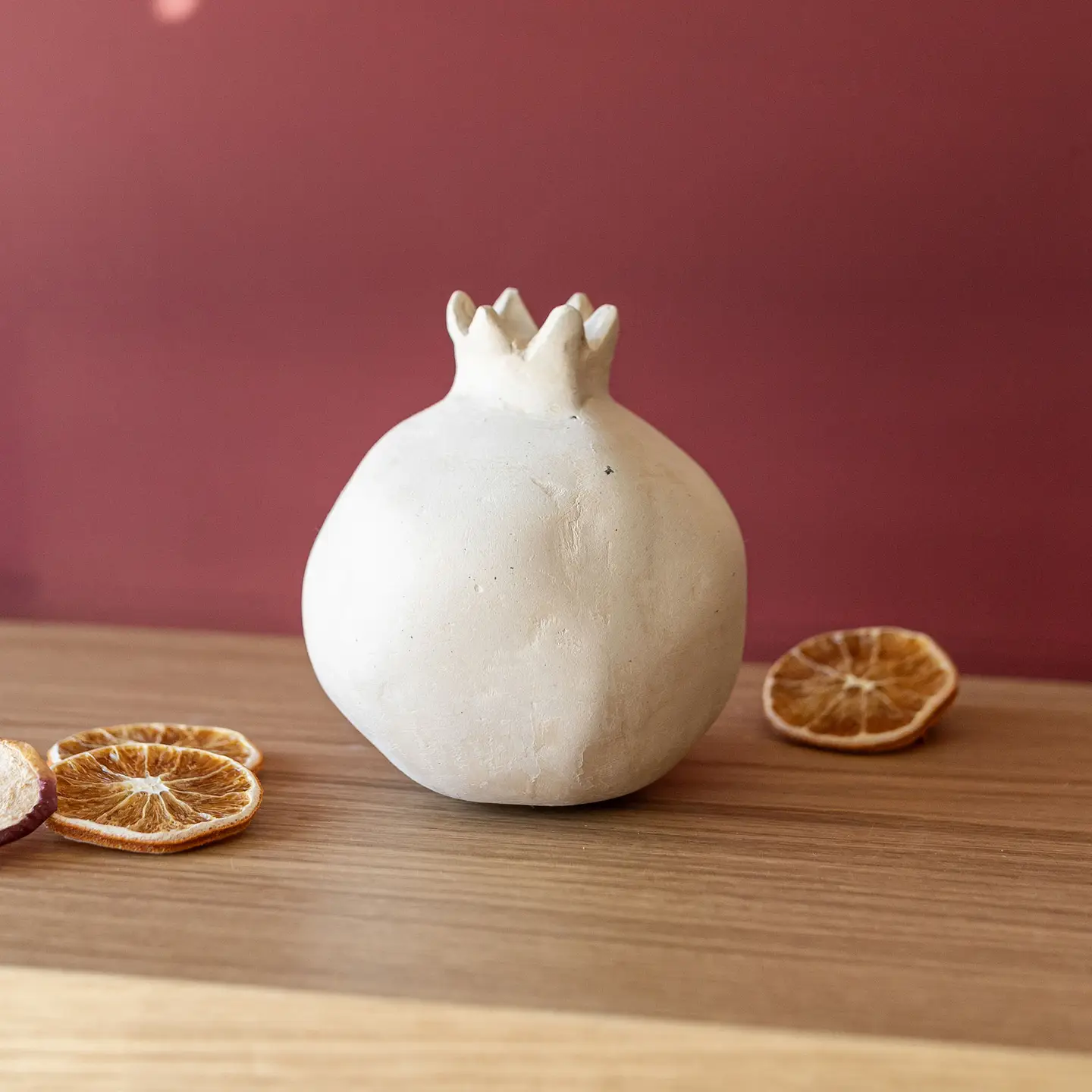 Handmade with recycled paper products using a traditional pulp method, this paper mache pomegranate is characterized by an artisanal craftsmanship that turns a decorative accent into a piece of art. Its soft, rustic, off-white finish complements most decor styles and infuses a quiet luxury aesthetic to your space. Add to a shelf, coffee table, mantel, or kitchen decor. The perfect accent to pair with winter holiday decor, the natural cream finish of this pomegranate transitions well through the seasons. -Artistic decorative accent perfect for shelf decor, coffee table, or mantel displays. -Made from recycled paper products using a traditional pulp method. Eco-friendly and biodegradable, it contributes to a sustainable environment. -Spot clean, avoid getting wet. -Material: Paper Mache