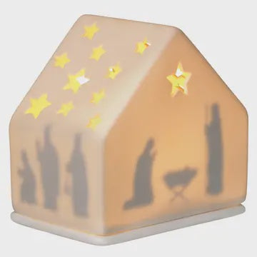 Village House - Nativity Silhouette is beautiful as a standalone work of art or together with a village of houses. This beautiful porcelain piece reminds us of the true meaning of Christmas. When lit, the silhouettes of the nativity appear on the walls of "stable" house. Beautiful house sits atop a porcelain base plate.