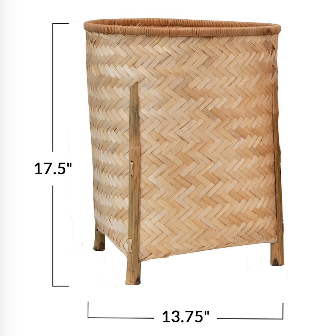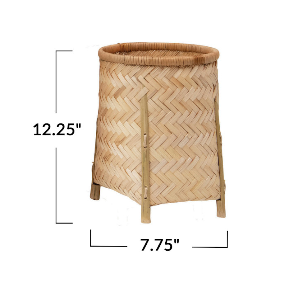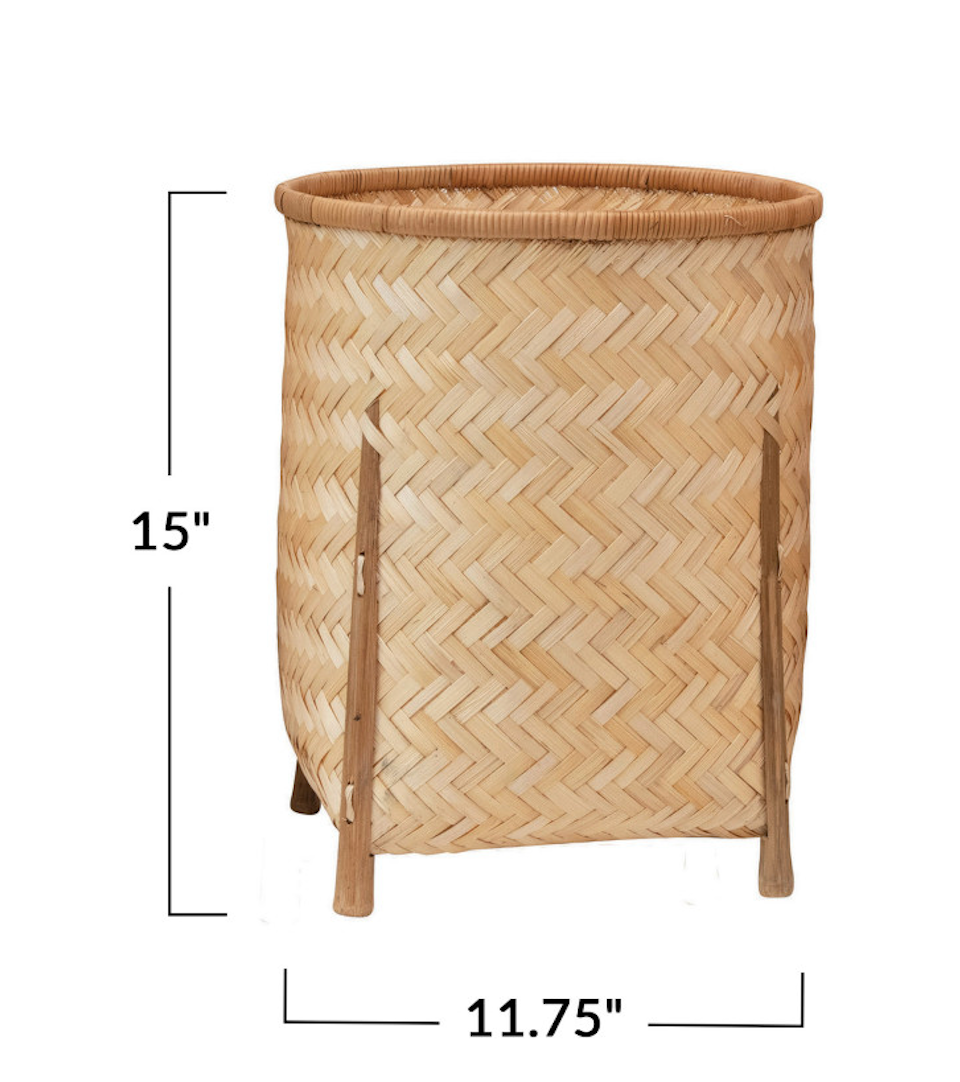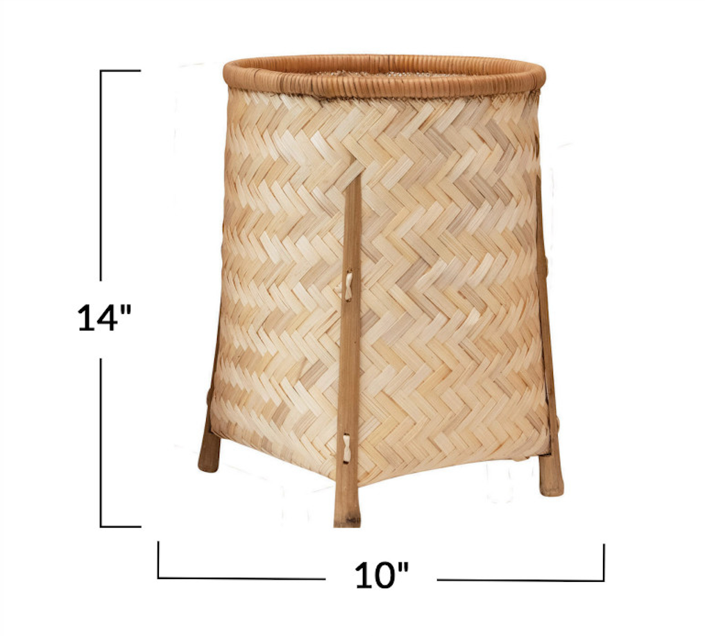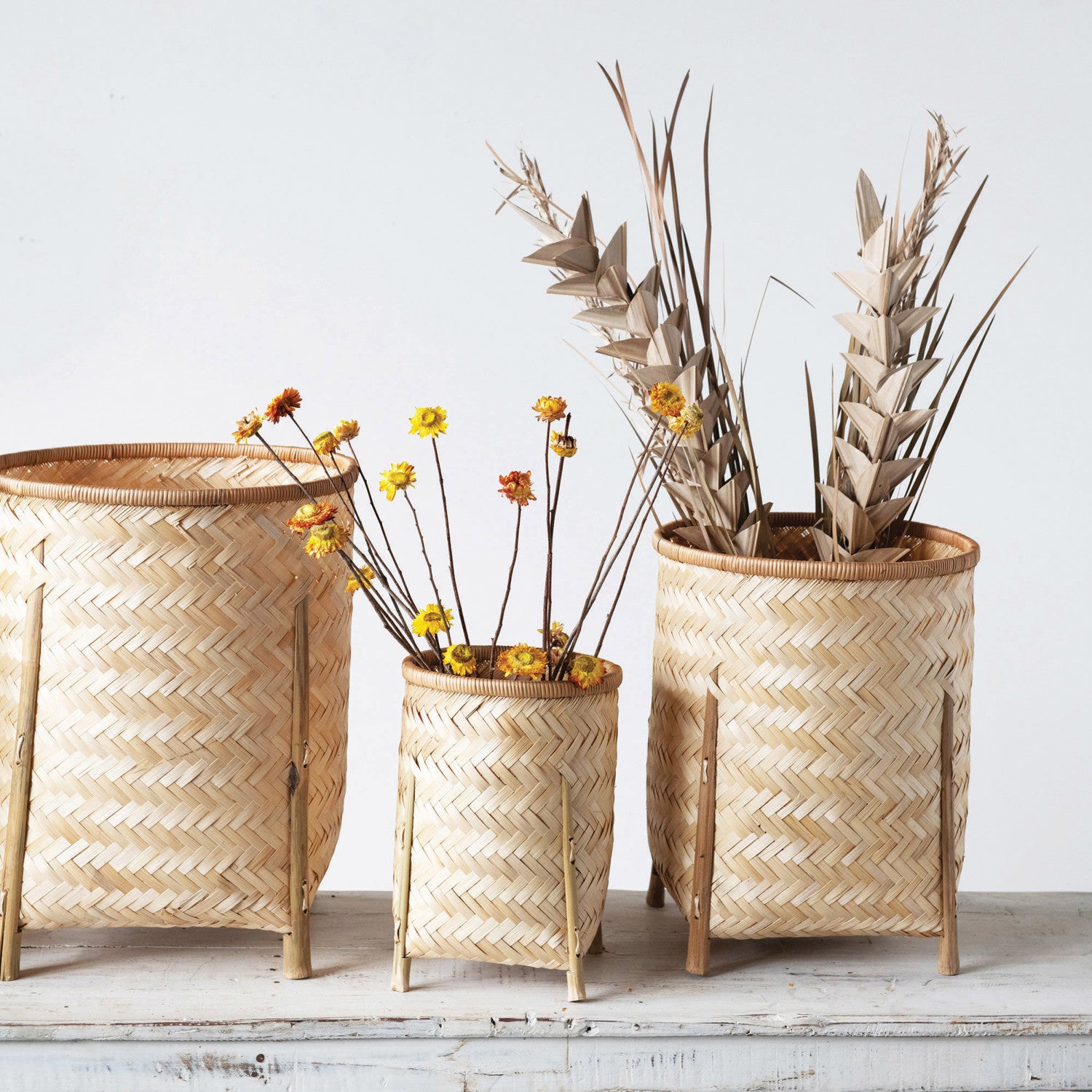 These artistically crafted woven bamboo baskets with legs. Perfect for decor or storage in a bedroom, living room, playroom, or office. Organization and cleanup will be a breeze with these baskets. Easily stores toys and throws or perfect holds dried or faux stems.